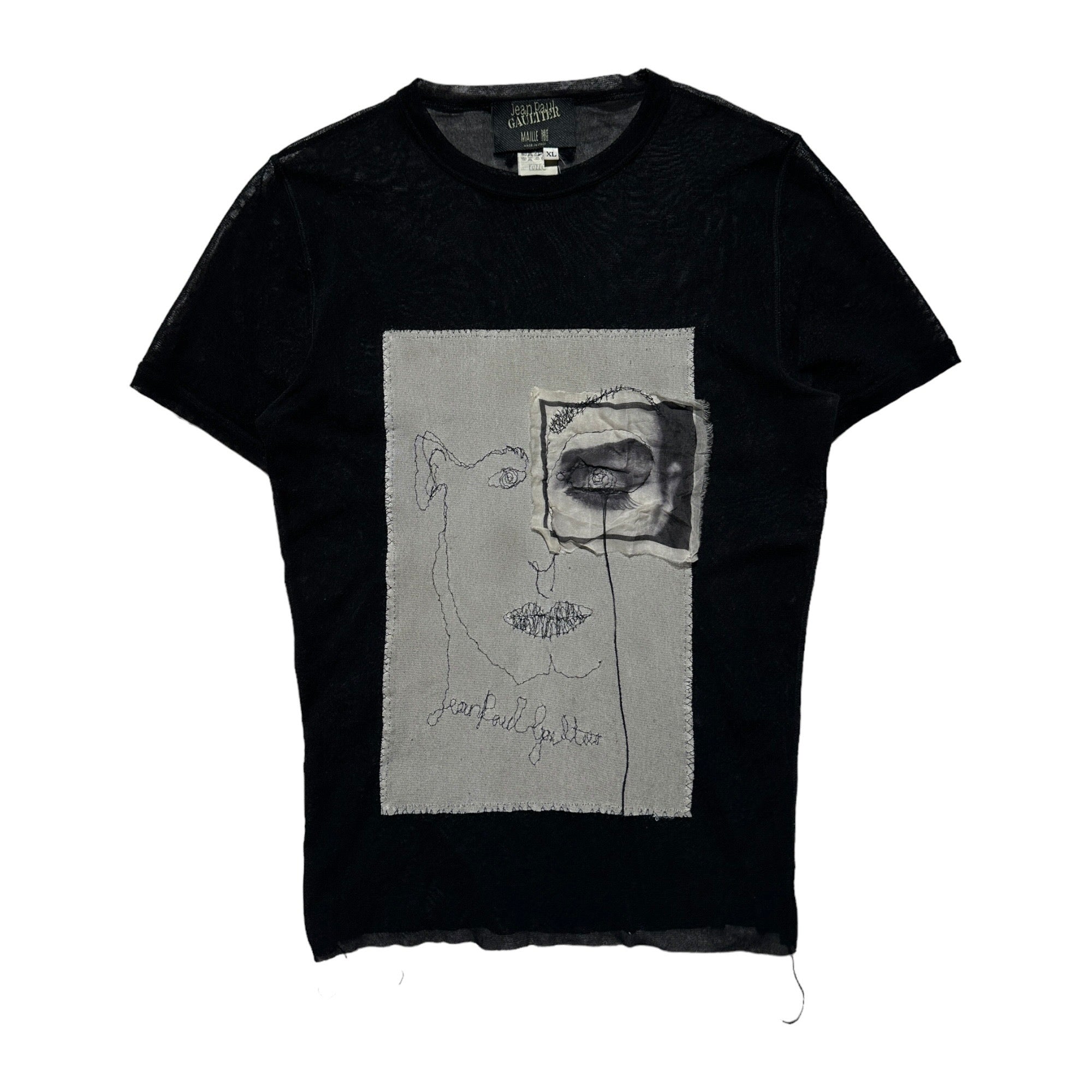 Rare find. Elegantly made stretchy mesh short sleeve with signature graphic throughout. Perfect unisex piece. Shoulders: 16”Pits: 17.5”Length: 26”Sleeve: 8”