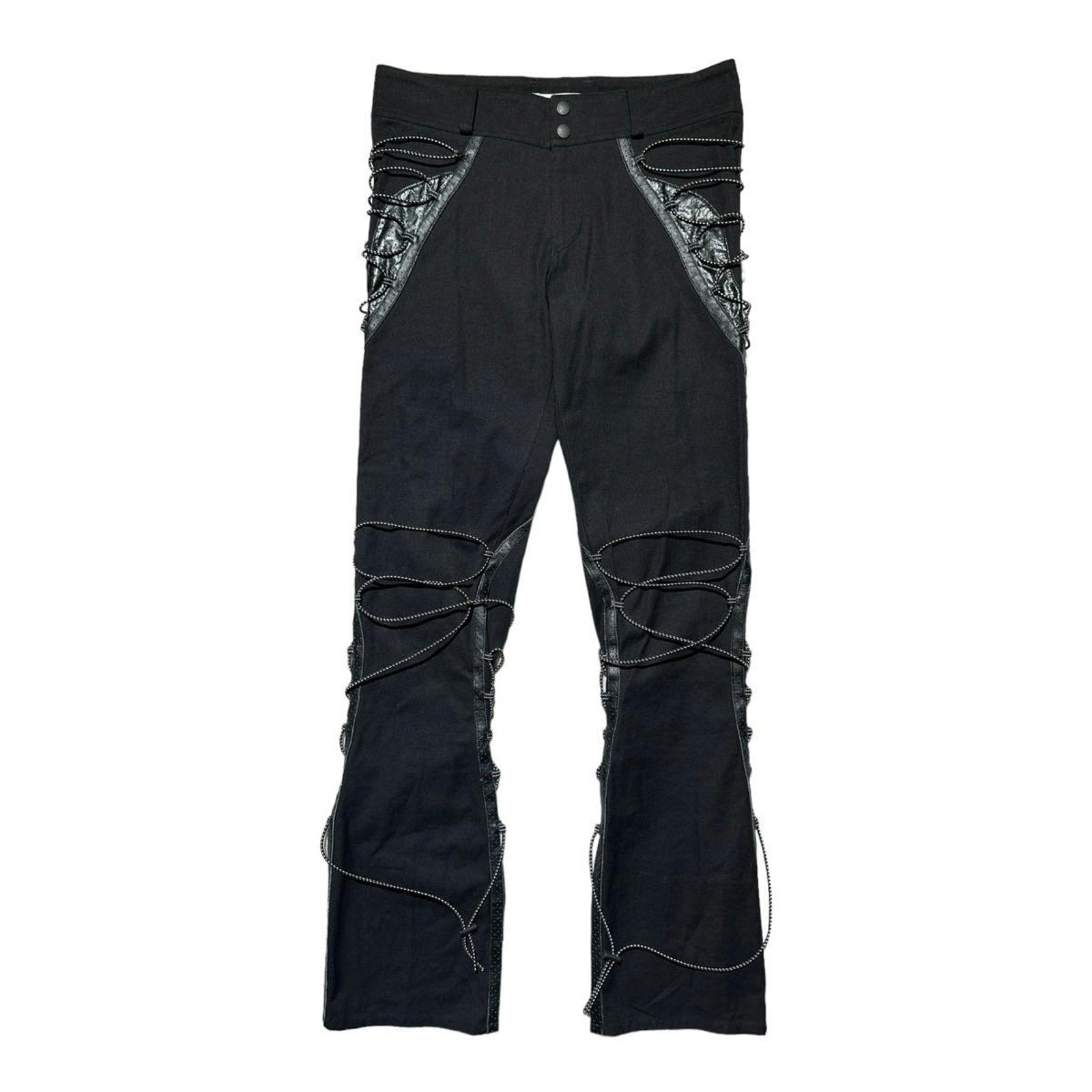 Iconic piece & rare find. A well tailored, deep black sturdy canvas pant that adjusts its fit based on the users preference. Features adjustable “Bungee” style lacing system throughout both legs, calf skin leather trimmings, nice flare out on leg. Waist: 31”Rise: 10”Inseam: 33”Leg Opening: 8”Shipping Policy• Please allow 2-5 business days for us to process and ship your order. When your order ships, you will receive your tracking number via email.Refund PolicyAll sales are final.