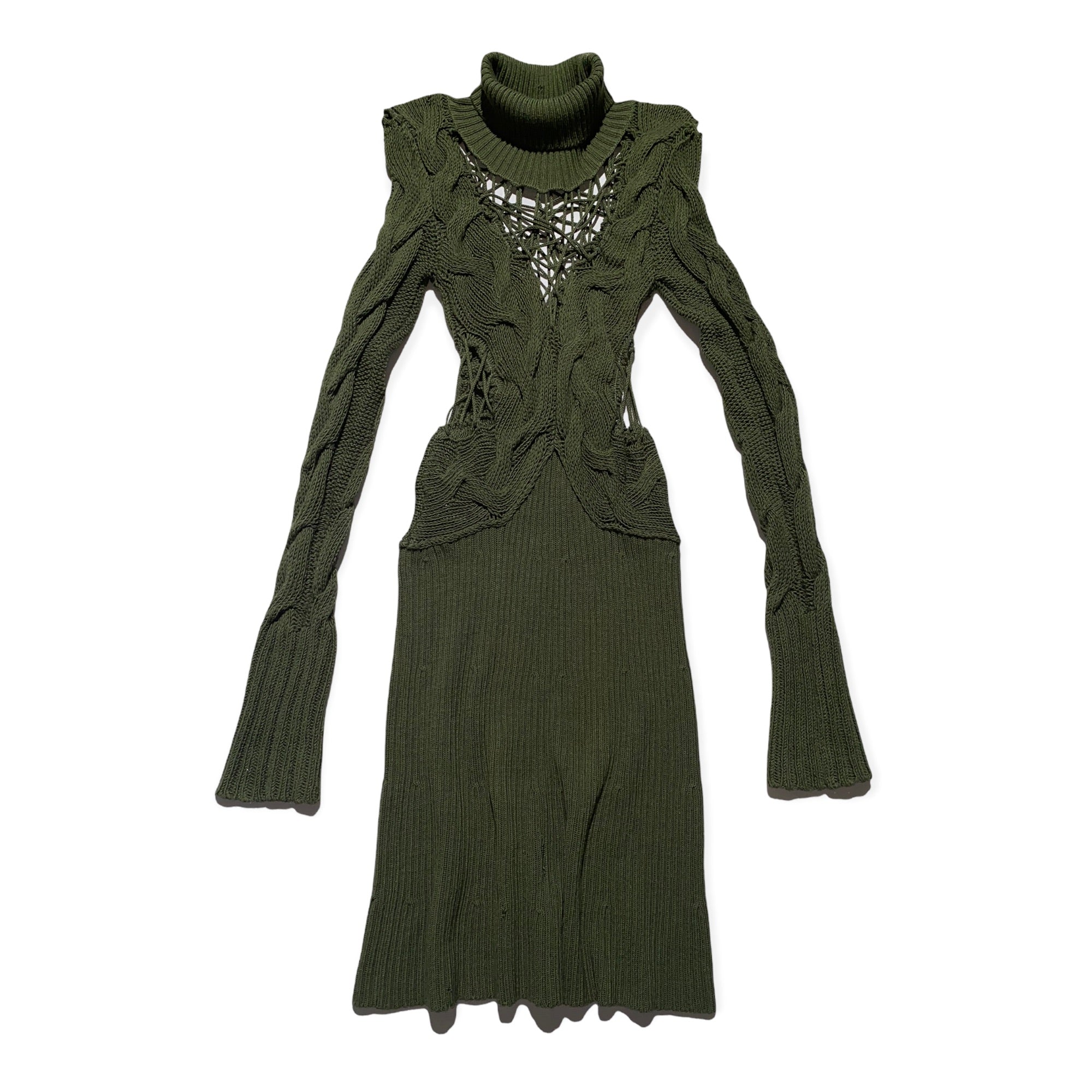 A beautiful 10 year old piece from McQueen, a full *and comfortable* wool knitted dress that’s stretchy yet coutures the body gracefully. Intricately weaved at sides and chest.