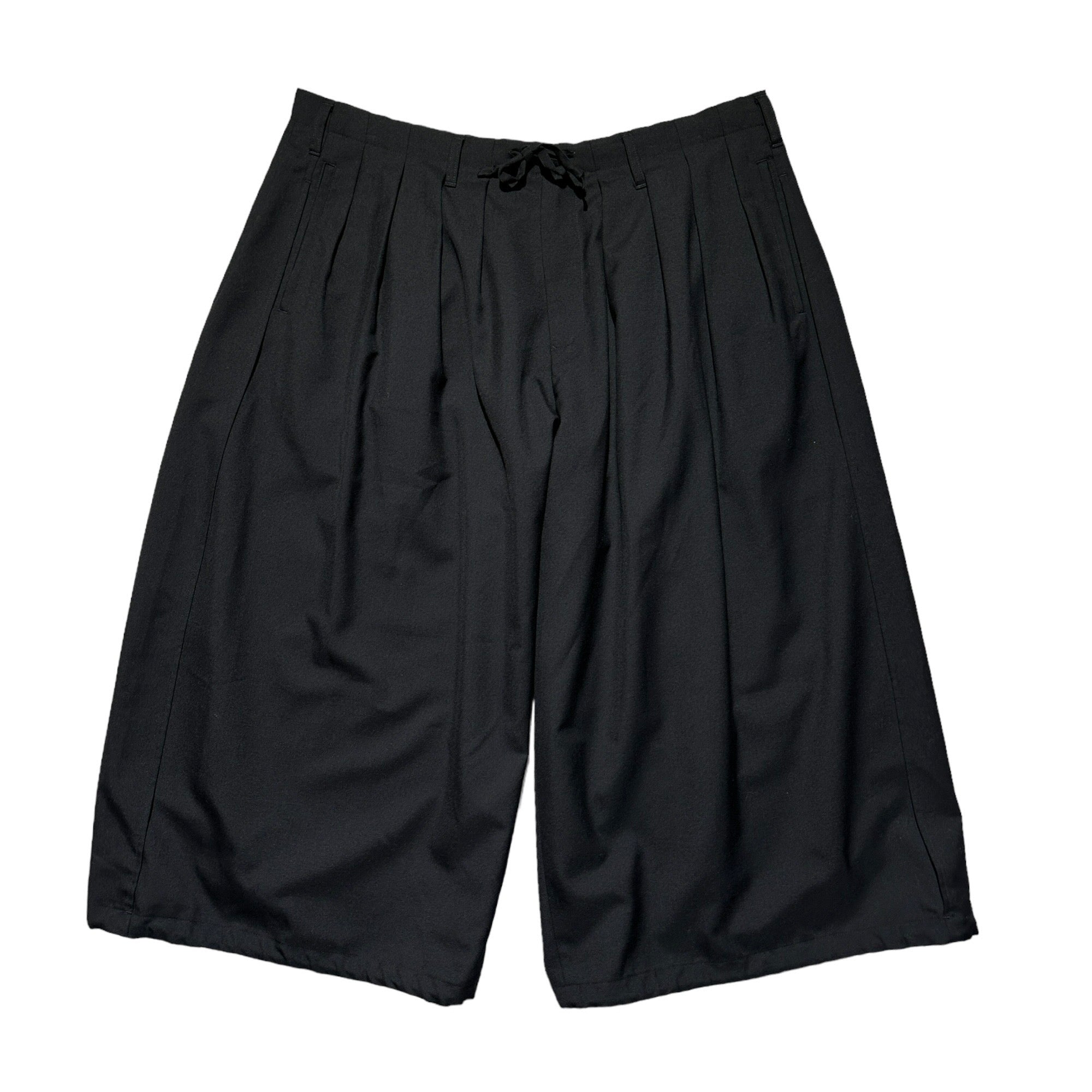 Deep black fine wool pleated shorts with an exaggerated fit and VERY adjustable waist and leg openings that fit everyone. Waist: 24-40”Rise: 14.5”Inseam: 24”Leg Opening: 20”
