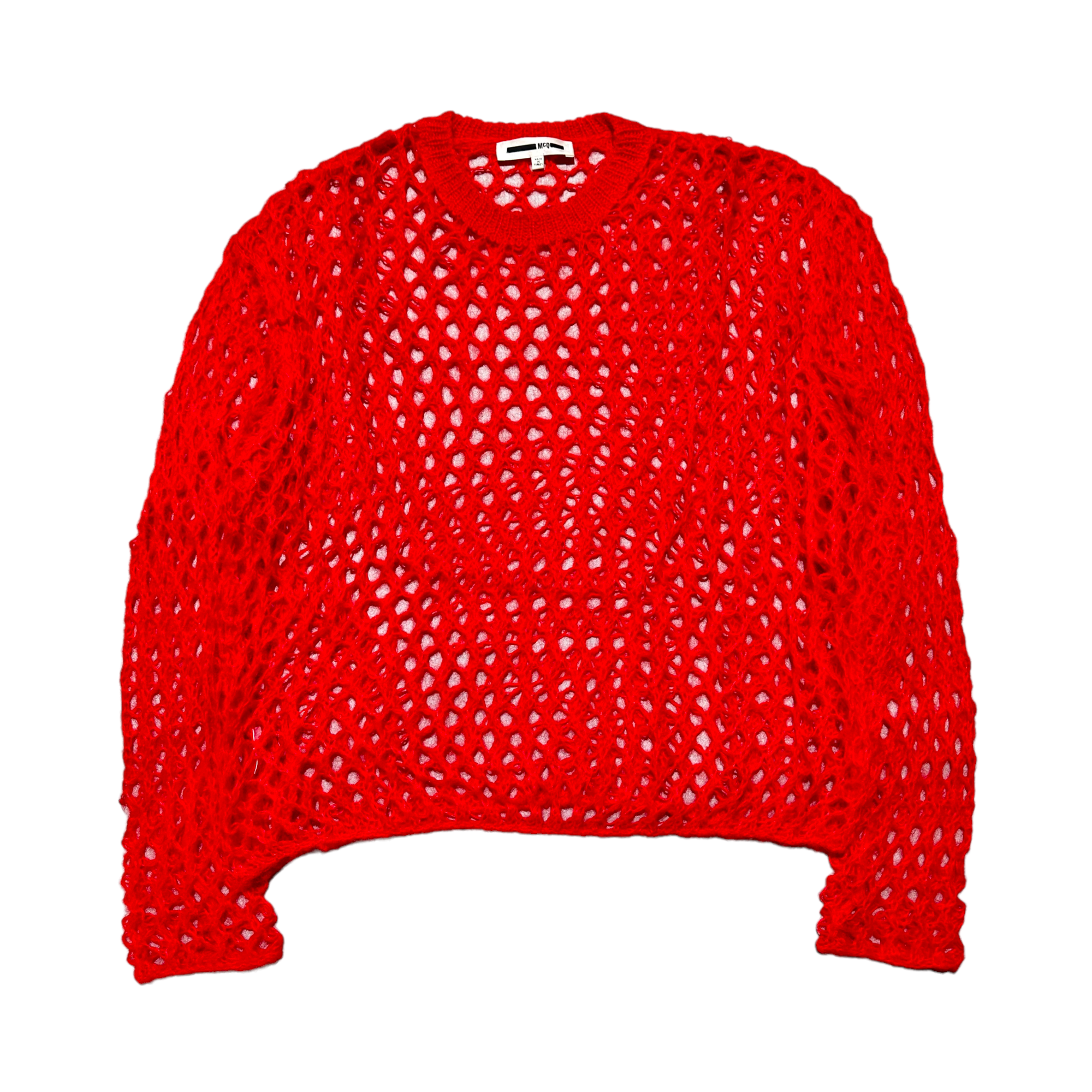 An intricately woven loose knitted sweater in a vibrant red. Perfect layering piece with a relaxed loose fit that works on plenty different sizes and body types.