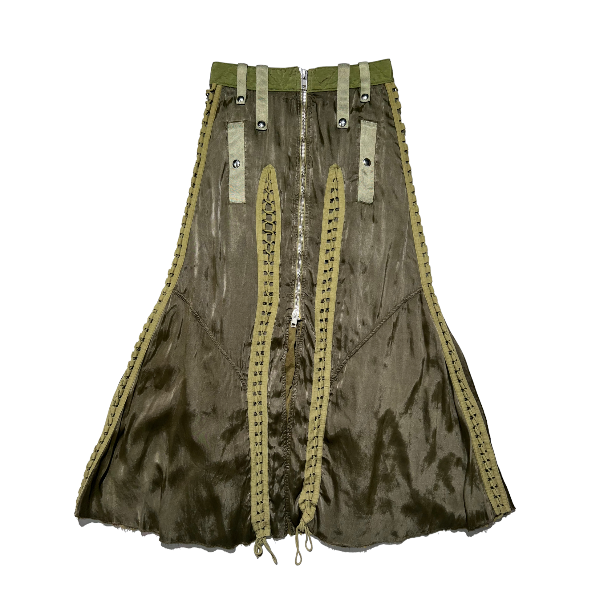 From the SS16 runway collection. Absolutely insane piece that won’t go out of style. A silk and viscose, double layered, long skirt that flows beautifully on body. Taking inspiration from flight suits, this piece has a way of conveying both elegance and functionality. Extremely detailed with adjustable lacing, snap buttoned clasps for belt loops, multiple pockets and a chunky zipper at front for style as well as adjustability.