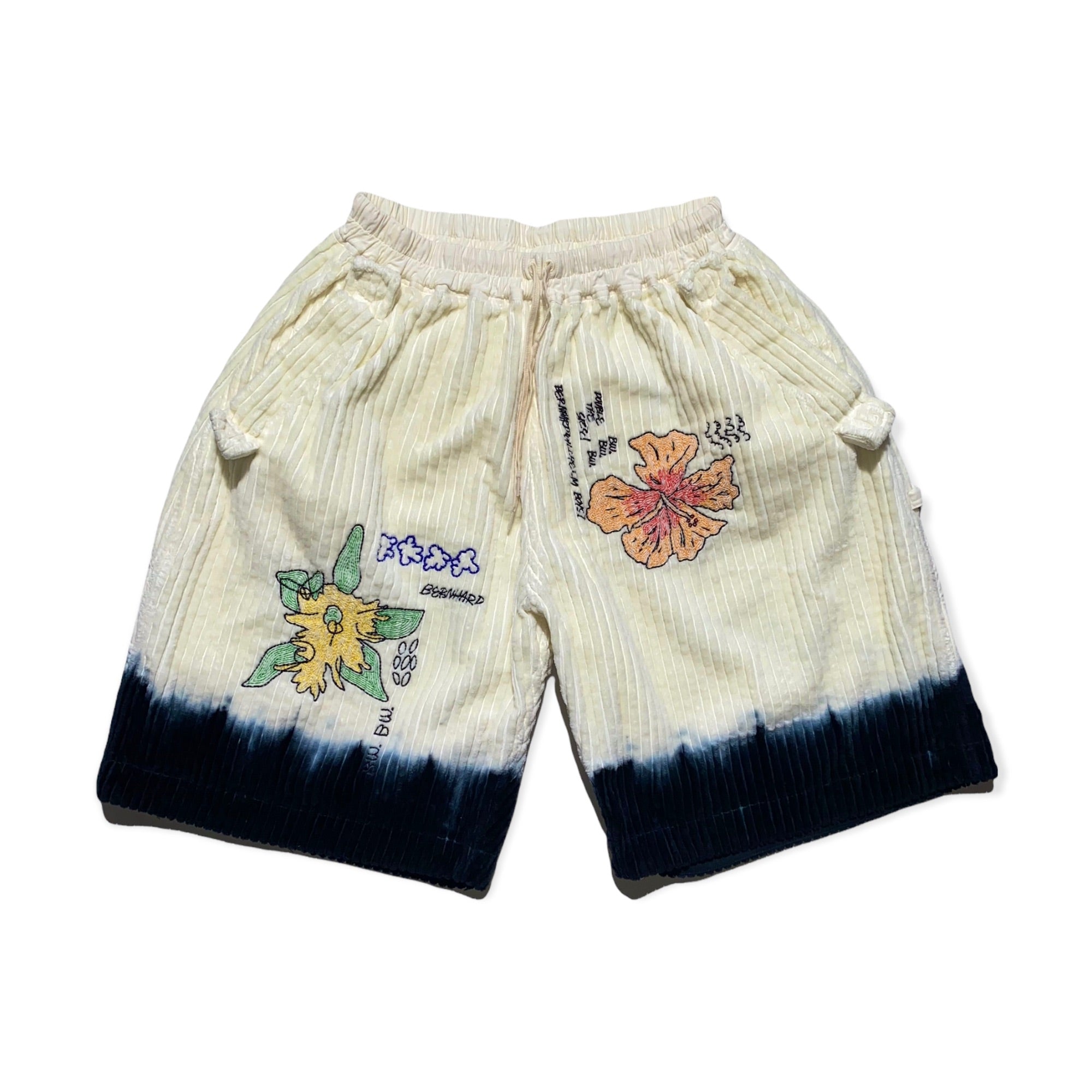 A cotton base short with plush, furry feeling polyester on top. Ribbed throughout, Ombré effect at bottom, thick embroidered graphics and wording, patches and 7 pockets. Caged pocket at back. Unisex, with a wide/roomy fit.
