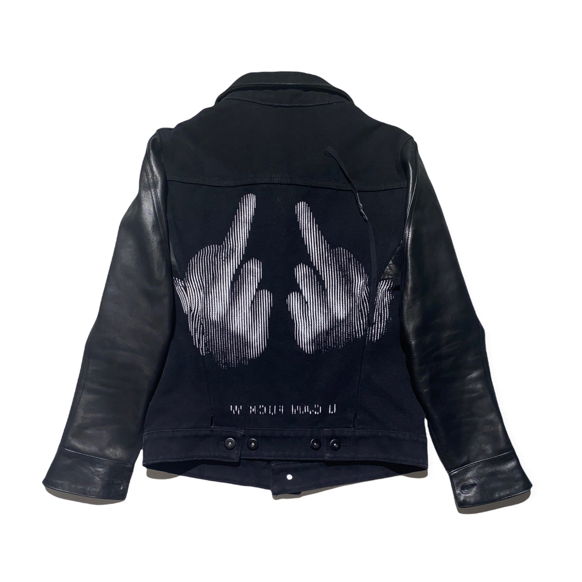 Deep black thick leather/denim combination jacket. Incredible make, quality, and fit. Black sturdy metal buttons. 2 internal Backpack straps that allow the jacket to hang off the shoulders. A big graphic of 2 middle fingers at the back to top it all off. A lifetime piece.