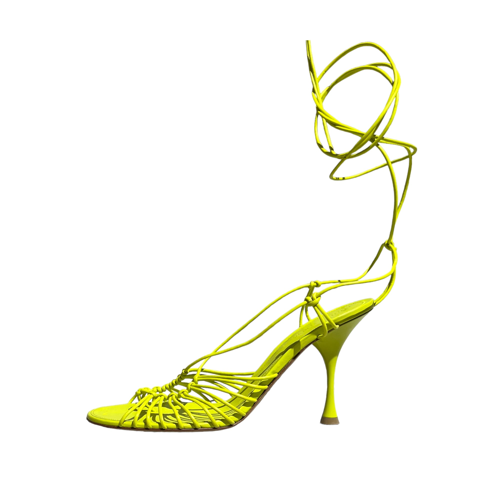 An intricate strap weaving throughout that goes up to calf. Superb quality heel in like new condition.