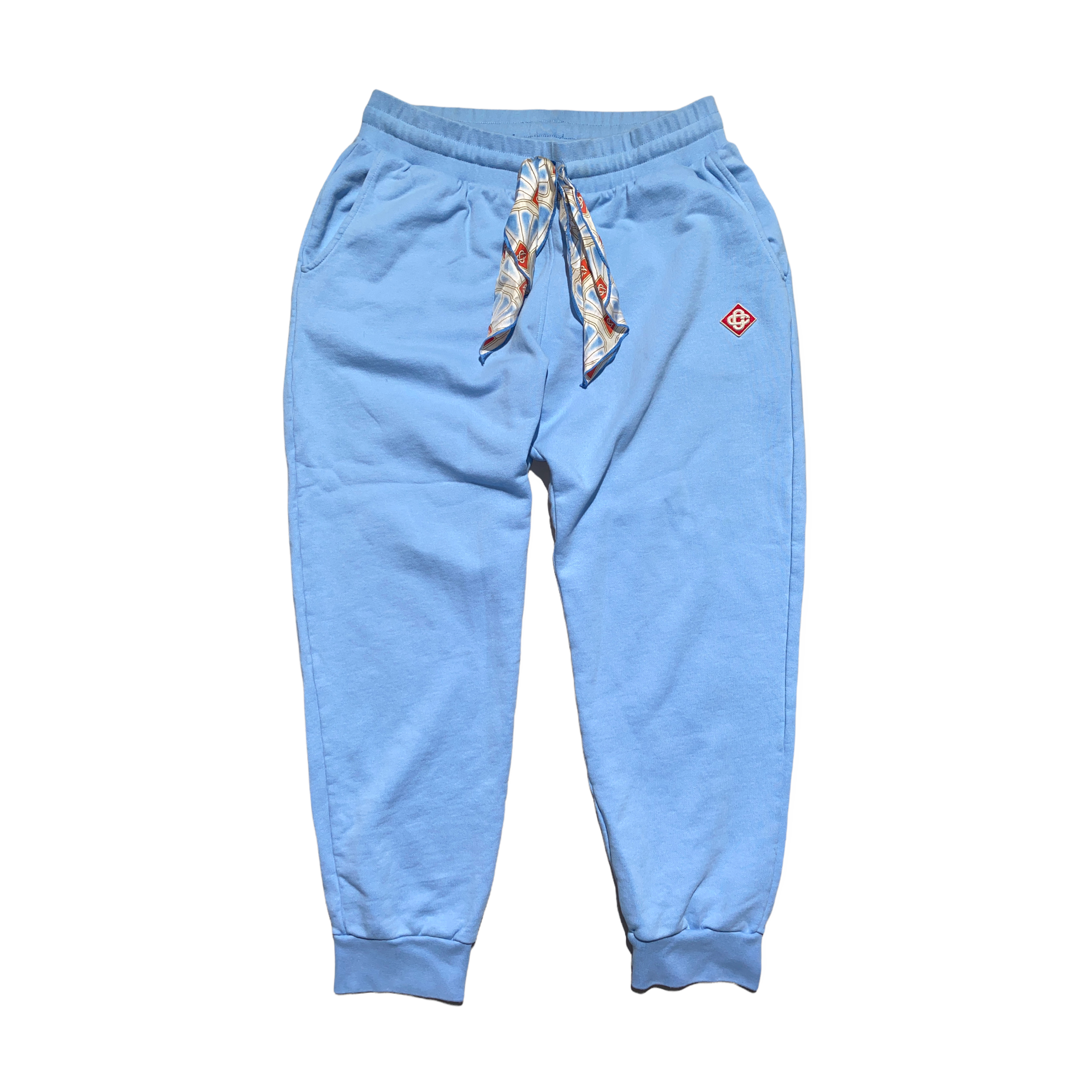 Baby blue mid weight luxury cotton sweats. Retail $700 Signature Casablanca logo embroidered over left thigh. Breathable & Insulated. Beautiful monogram scarf drawstring detail.