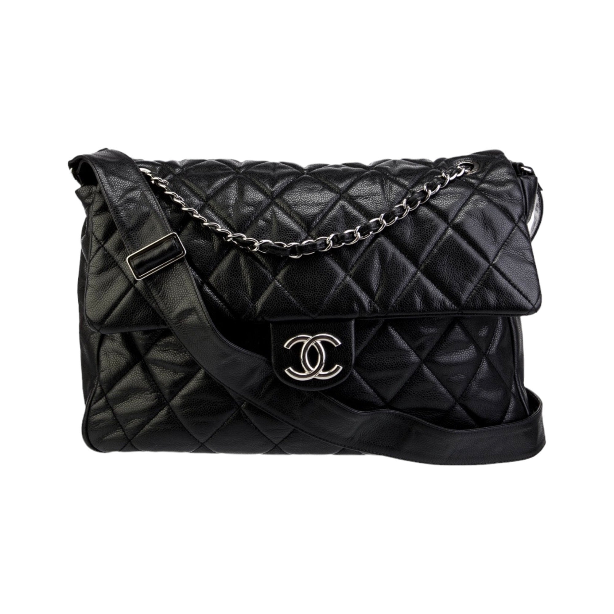 One of Chanel‘s most versatile bags. A soft, yet sturdy caviar leather quilted messenger flap bag with silver hardware. 1 leather strap & 2 chain link straps make this a perfect unisex piece. Ideal for any occasion. Lined in beige textile material with 3 pockets.