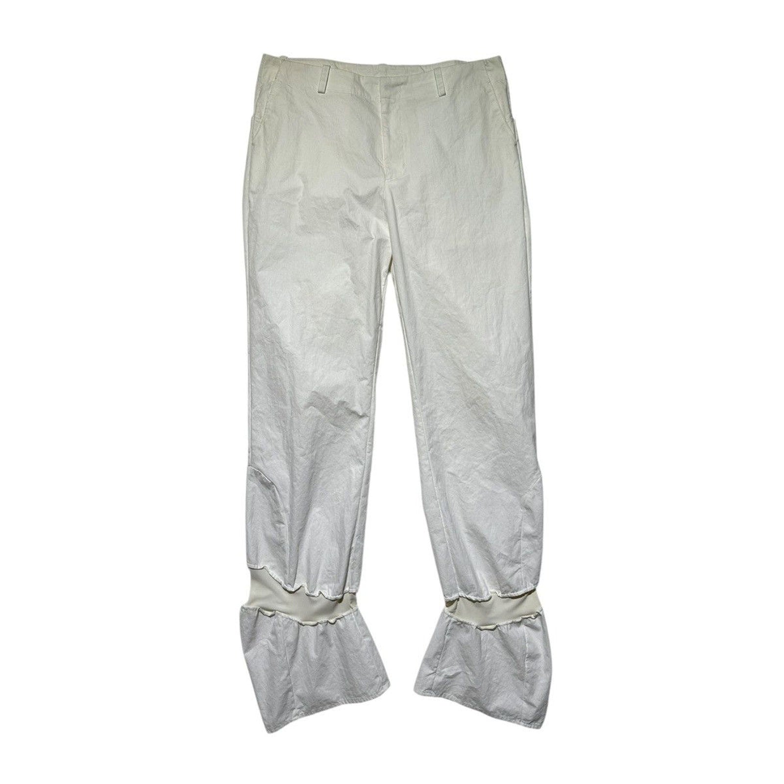 A classic cotton pant in white with ribbed stretch fabric inserts at leg. Minor discoloration. Could use a good whitening/dry clean. Waist: 32”Rise: 11”Inseam: 32”Leg Opening: 10”Shipping Policy• Please allow 2-5 business days for us to process and ship your order. When your order ships, you will receive your tracking number via email.Refund Policy• All sales are final.