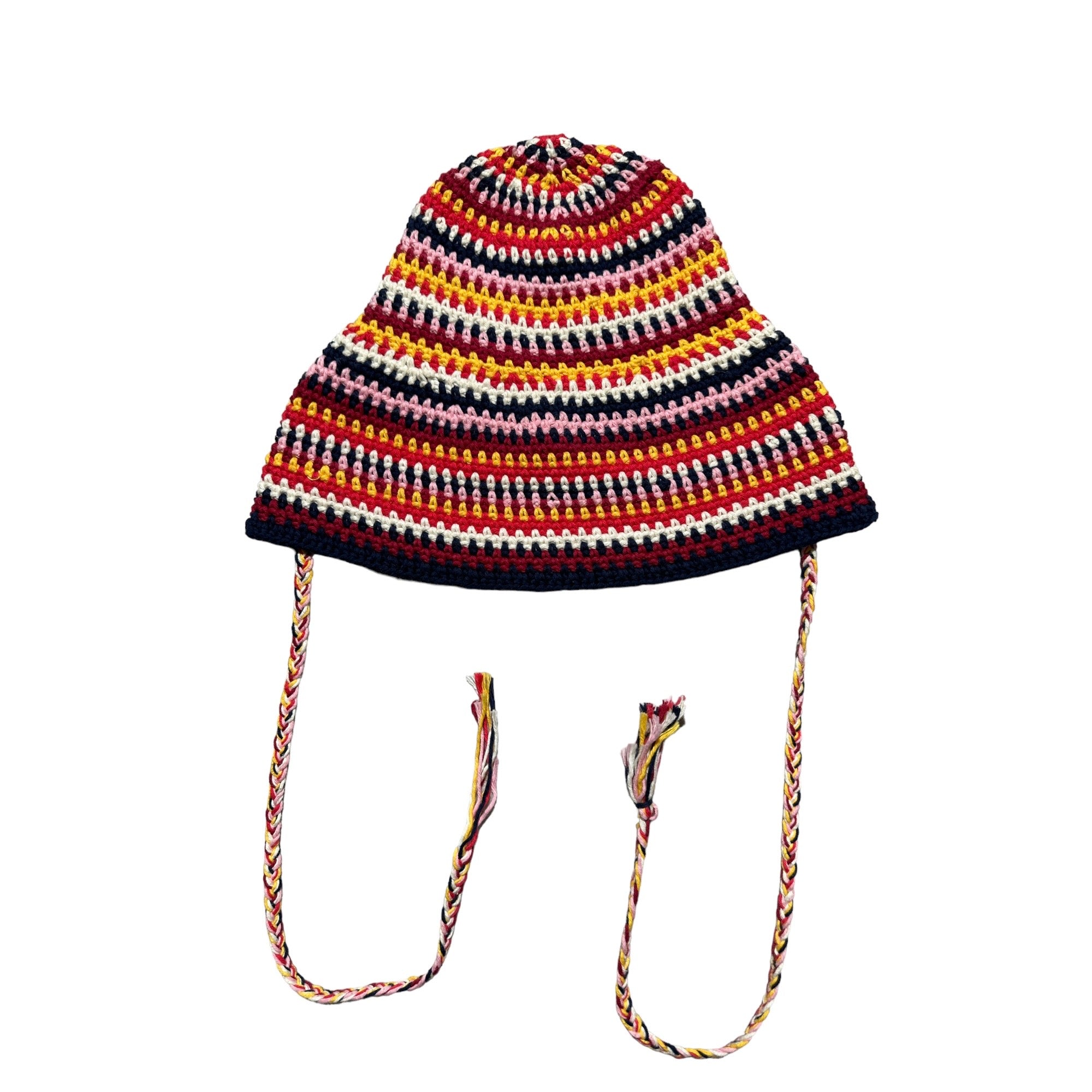 A thick woven cotton bucket hat style beanie. Stretchy and comfortable. Multicolor that pairs well with so much. Hanging tassels on each side.