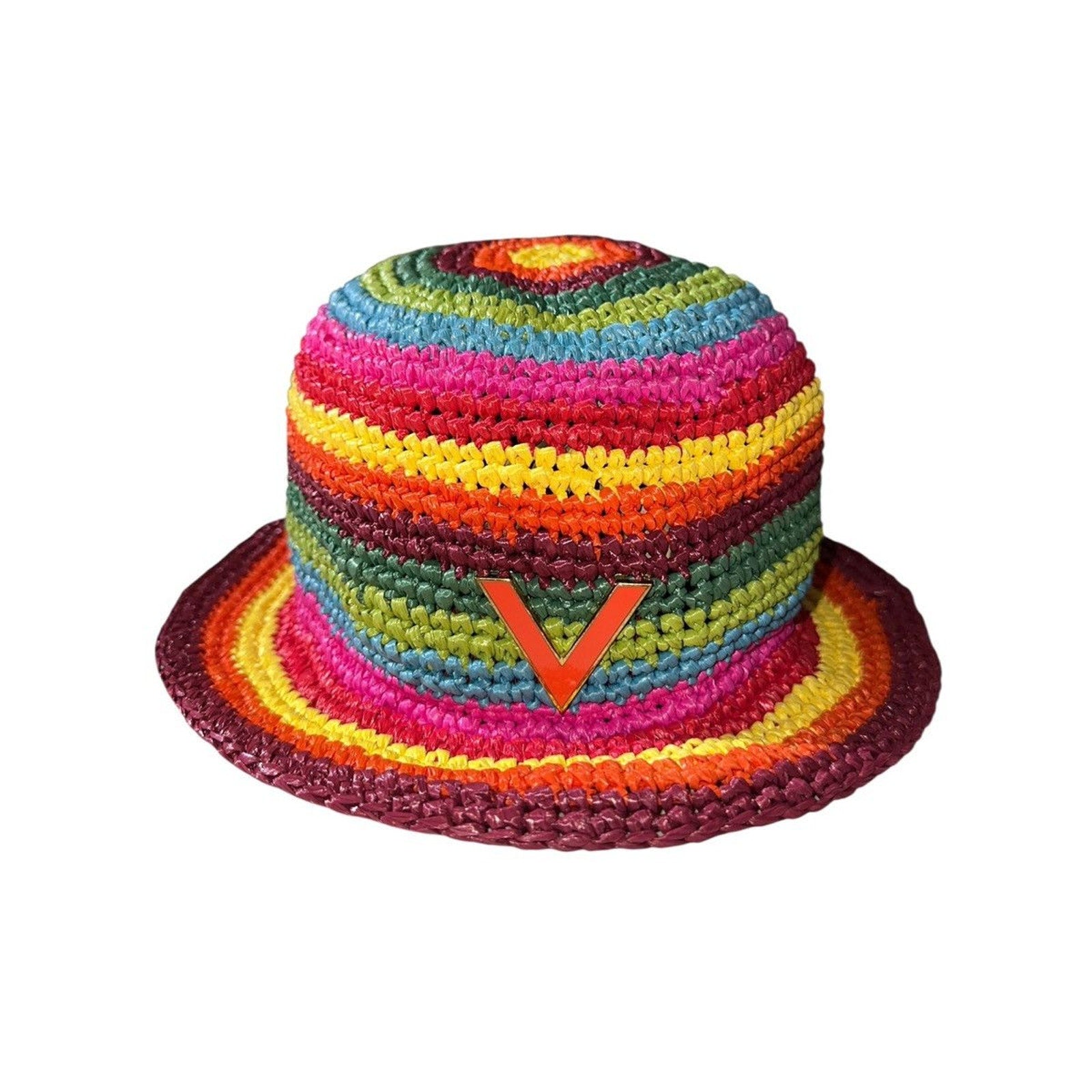 This crochet bucket hat from Valentino has a colorful striped design. Adorned with a logo plaque, it has a narrow brim.
