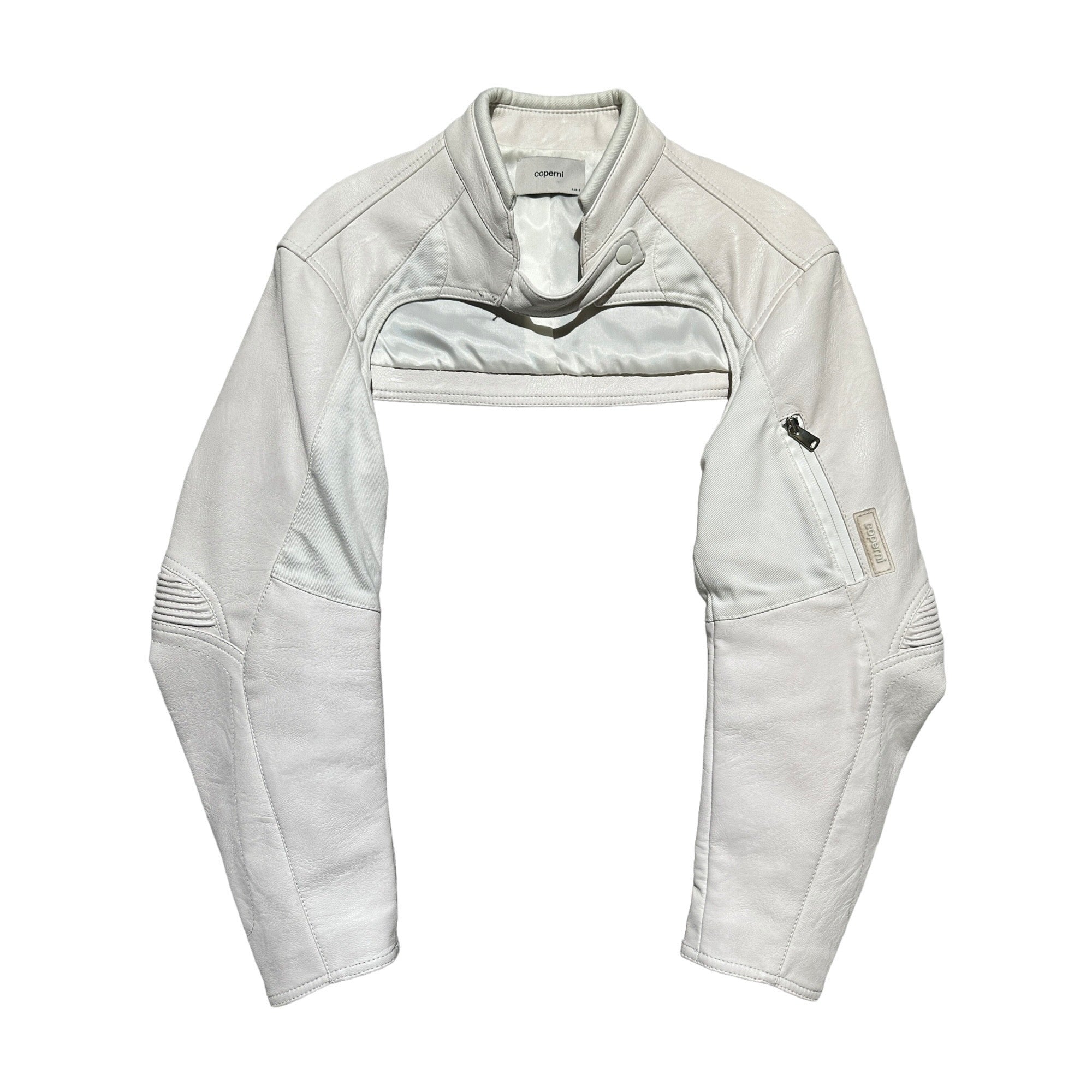 A moto style jacket with leather and cotton panels (for ease and comfort). Beautifully cropped to where it’s just a layering piece for the arms.  Shipping Policy