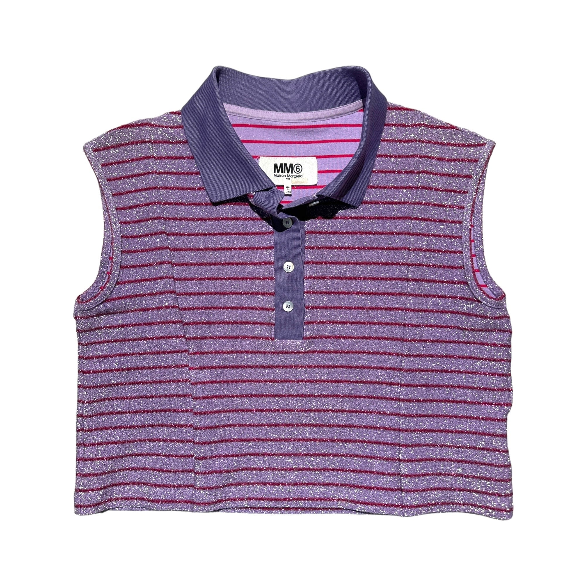 Beautiful and quality polo with an allover lurex/glitter style. Lavender base with red stripes. Cropped boxy design. Shoulders: 17” Pits: 19” Length: 17”Shipping Policy• Please allow 2-5 business days for us to process and ship your order. When your order ships, you will receive your tracking number via email.Refund PolicyAll sales are final.