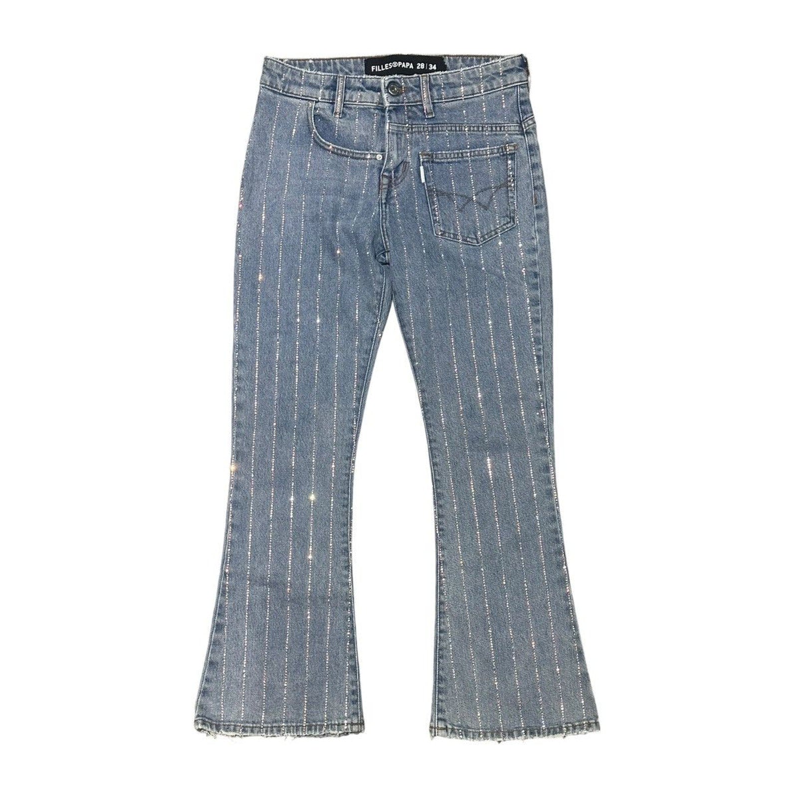 A lux classic blue denim with a flared fit and crystal jewels all throughout.Waist: 28”Rise: 10”Inseam: 26”Leg Opening: 9”Shipping Policy •Please allow 2-5 business days for us to process and ship your order. When your order ships, you will receive your tracking number via email.Refund PolicyAll sales are final.