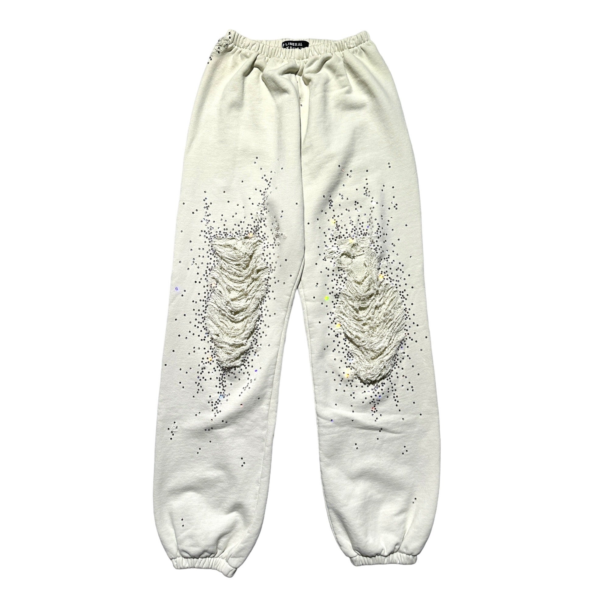 Beautiful pair of cream/off white sweats made with plush cotton, distressed at each knee with crystals dancing throughout. The perfect elevated loungewear. Tags attached. Waist: 22-36”Rise: 12.5”Inseam: 30”Leg Opening: 5”