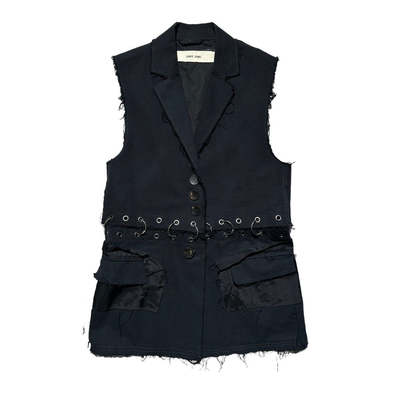 An amazing quality, deep black vest with cut out design held together by pierced rings. Frayed shredded end finishing. Satin trimming throughout. Truly beautiful piece.Pits: 18.5”Shoulders: 16”Length: 29”Shipping Policy• Please allow 2-5 business days for us to process and ship your order. When your order ships, you will receive your tracking number via email.Refund PolicyAll sales are final.