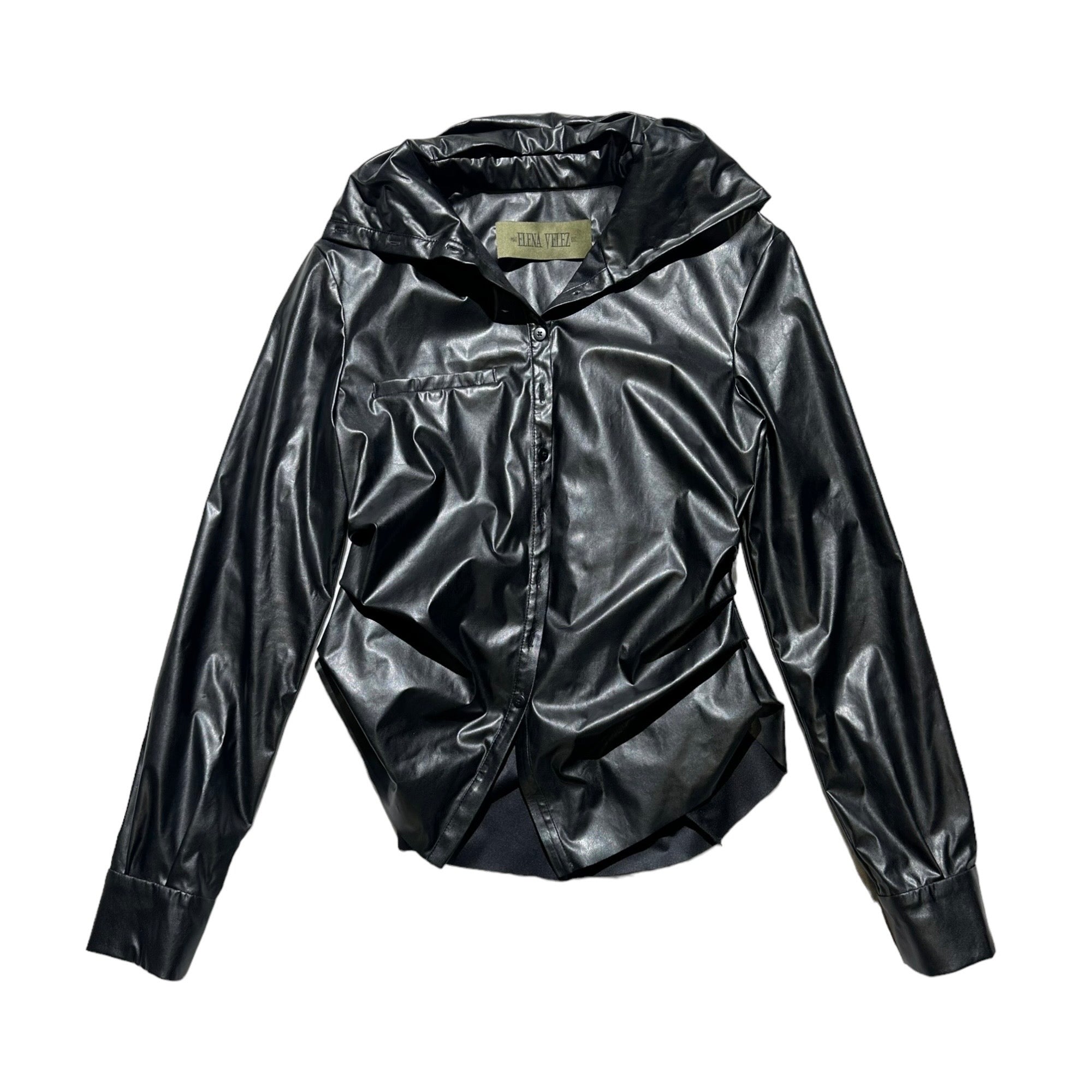 Retail $675 Deep black glossy/waxed style fabric with a runched distorted fit. Perfect for everyday wear. Shoulders: 17”Pits: 17”Length: 25.5”Sleeve: 26”