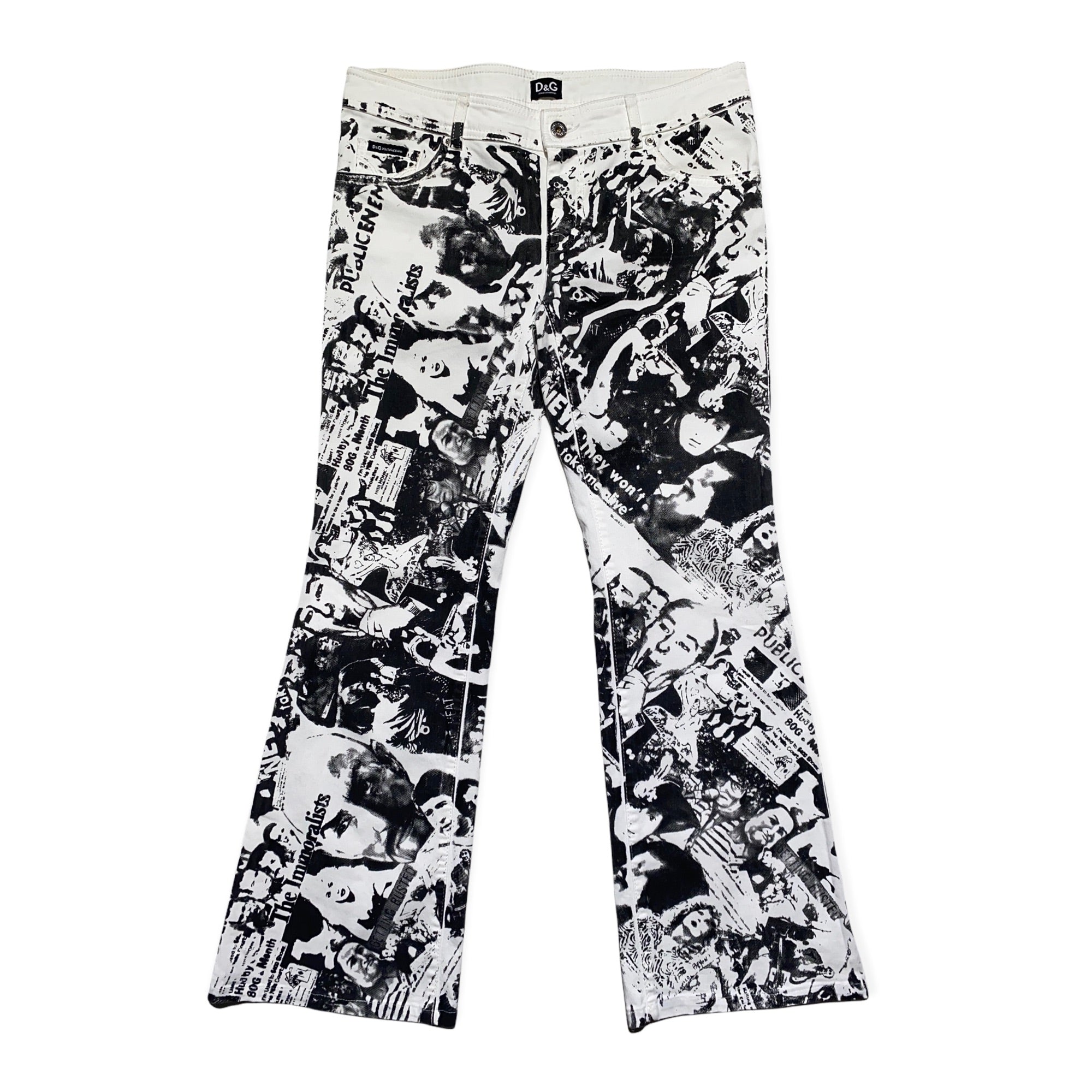 Incredible piece. A vintage pair of Dolce jeans. All over deep black graphic print of faces, quotes, and then some, on a white jean. Silver Logo plague on back pocket. Women’s denim size 28, and can fit a male size 30. The denim has some stretch and a great fit with a flared bottom.