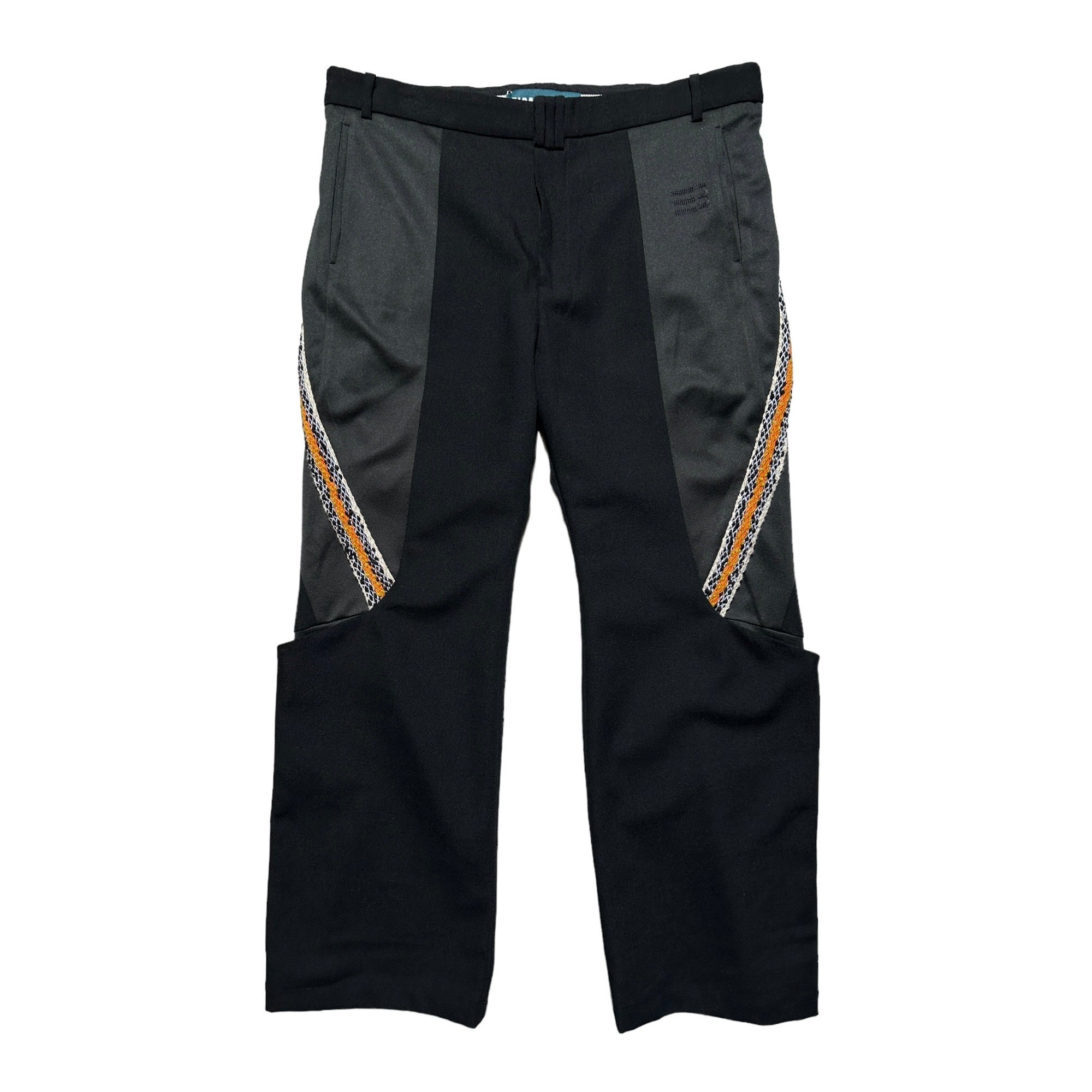 MSRP: $610A deep black wool pant with hybrid/split design, spiral fit, and inserted woven stripe throughout both legs. Waist: 36”Rise: 13”Inseam: 29”Leg Opening: 10.5”