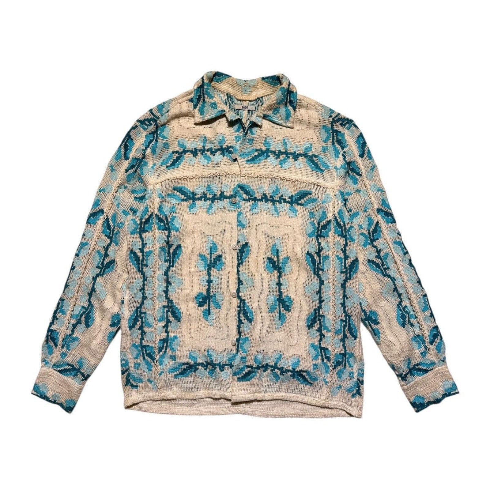 Long sleeve cotton filet lace shirt in white featuring graphic embroidered pattern in tones of blueShoulders: 17.5”Pits: 21”Length: 27”Sleeve: 23.5”Shipping Policy• Please allow 2-5 business days for us to process and ship your order. When your order ships, you will receive your tracking number via email.Refund Policy• All sales are final.