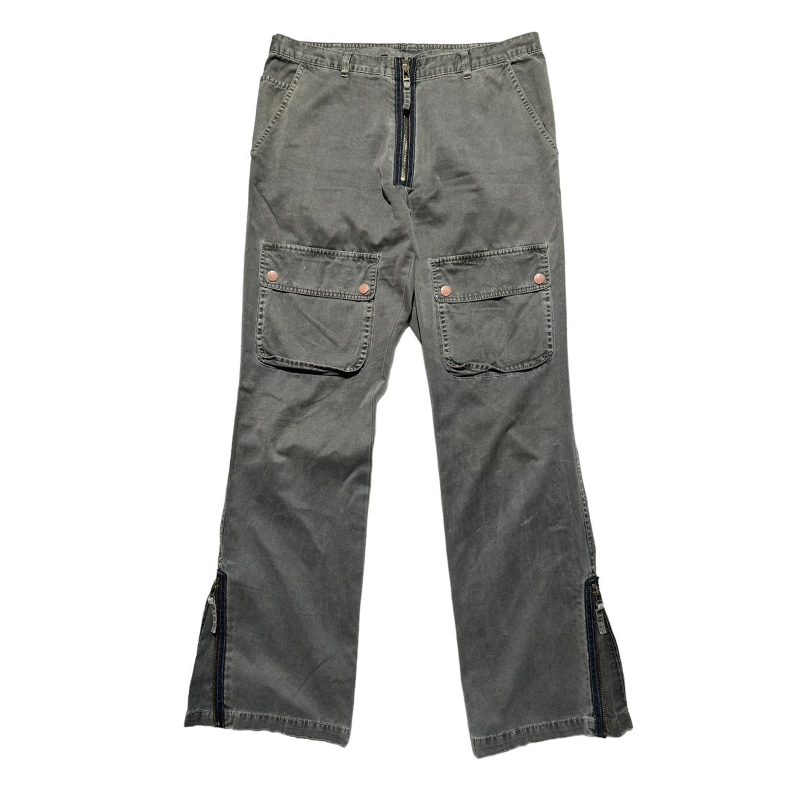 A sturdy canvas pant with big cargo pockets, JPG engraved buttons, exposed zipper front & adjustable flare zippered legs.