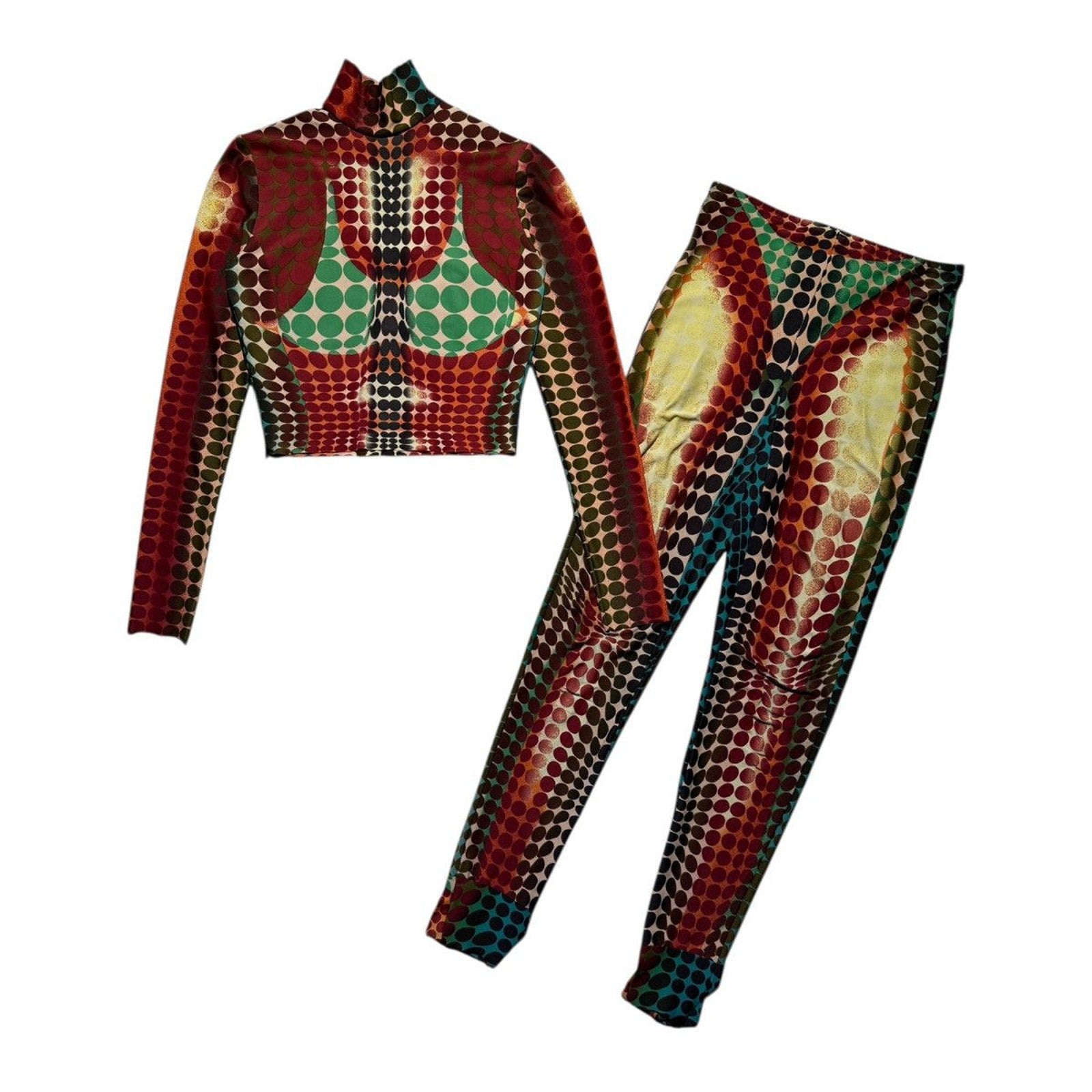 Iconic piece of Gaultier history. From the runway in 1995. This fits incredibly on most bodies as both items are stretchy. Great condition for its age. Top M bottom LShoulders: 13”Pits: 15.5” Length: 16.5”Sleeve: 23.5”Waist: 26-32”Rise: 10.5”Inseam: 30”Leg Opening: 4”Shipping Policy• Please allow 2-5 business days for us to process and ship your order. When your order ships, you will receive your tracking number via email.Refund Policy• All sales are final.