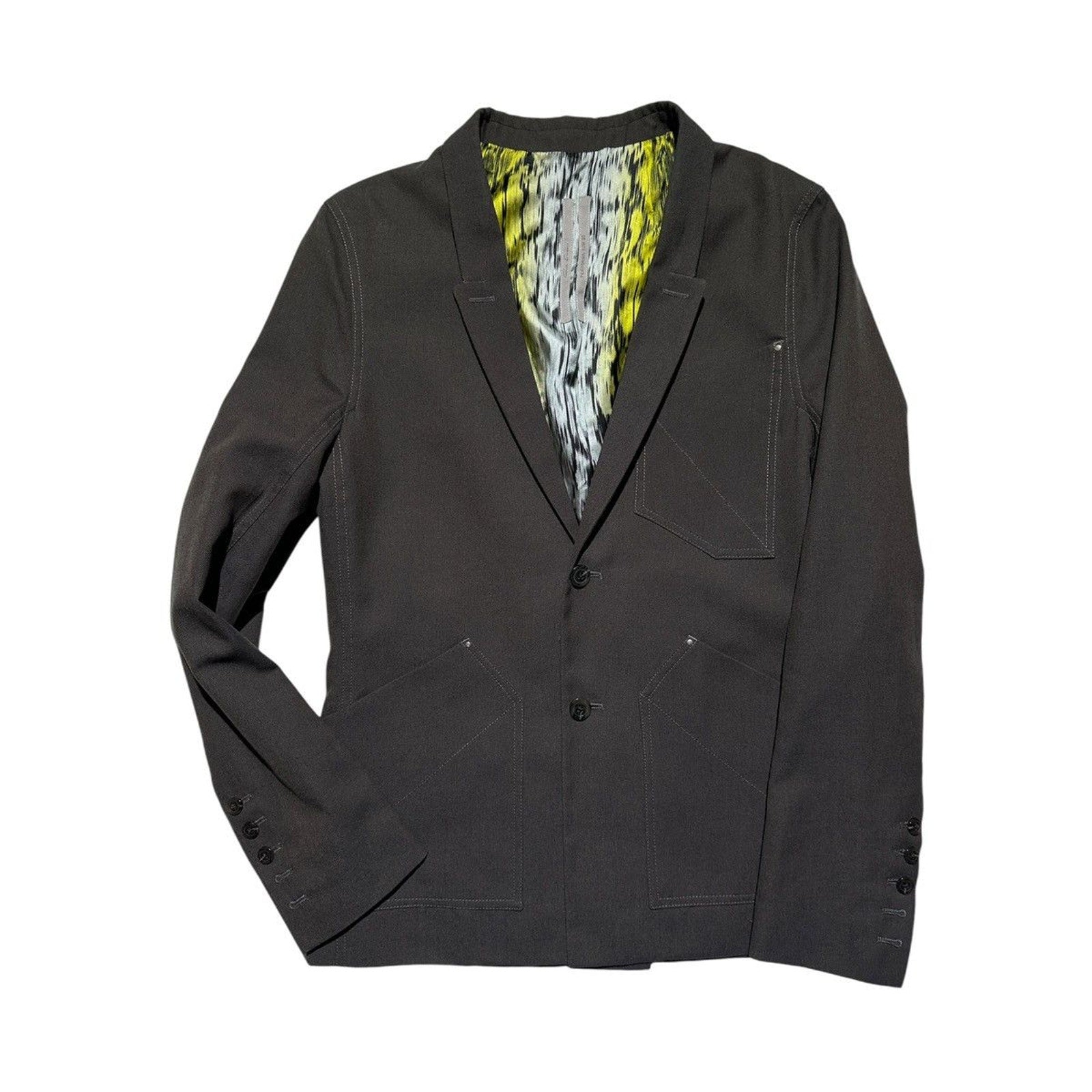A lightweight blazer style shirt jacket that features an incredible fit, 3 pockets, graphic silk lining, & bondage strap at back.