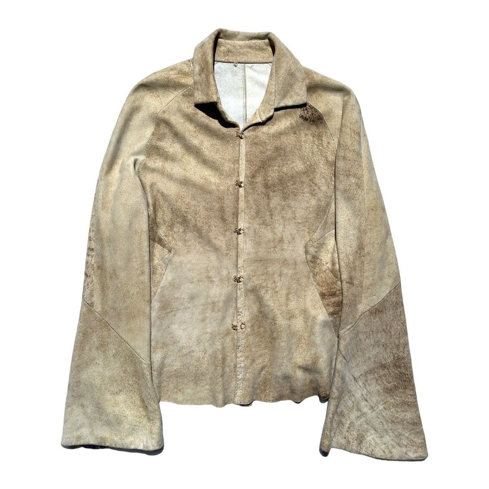 Incredible piece. A lightweight leather piece with a beautiful color and cut. Flared sleeves, golden clasp closure that gives the body definition.Pits: 21”Shoulders: 18”Length: 23”Sleeves: 23”Shipping Policy • Please allow 2-5 business days for us to process and ship your order. When your order ships, you will receive your tracking number via email.Refund PolicyAll sales are final.