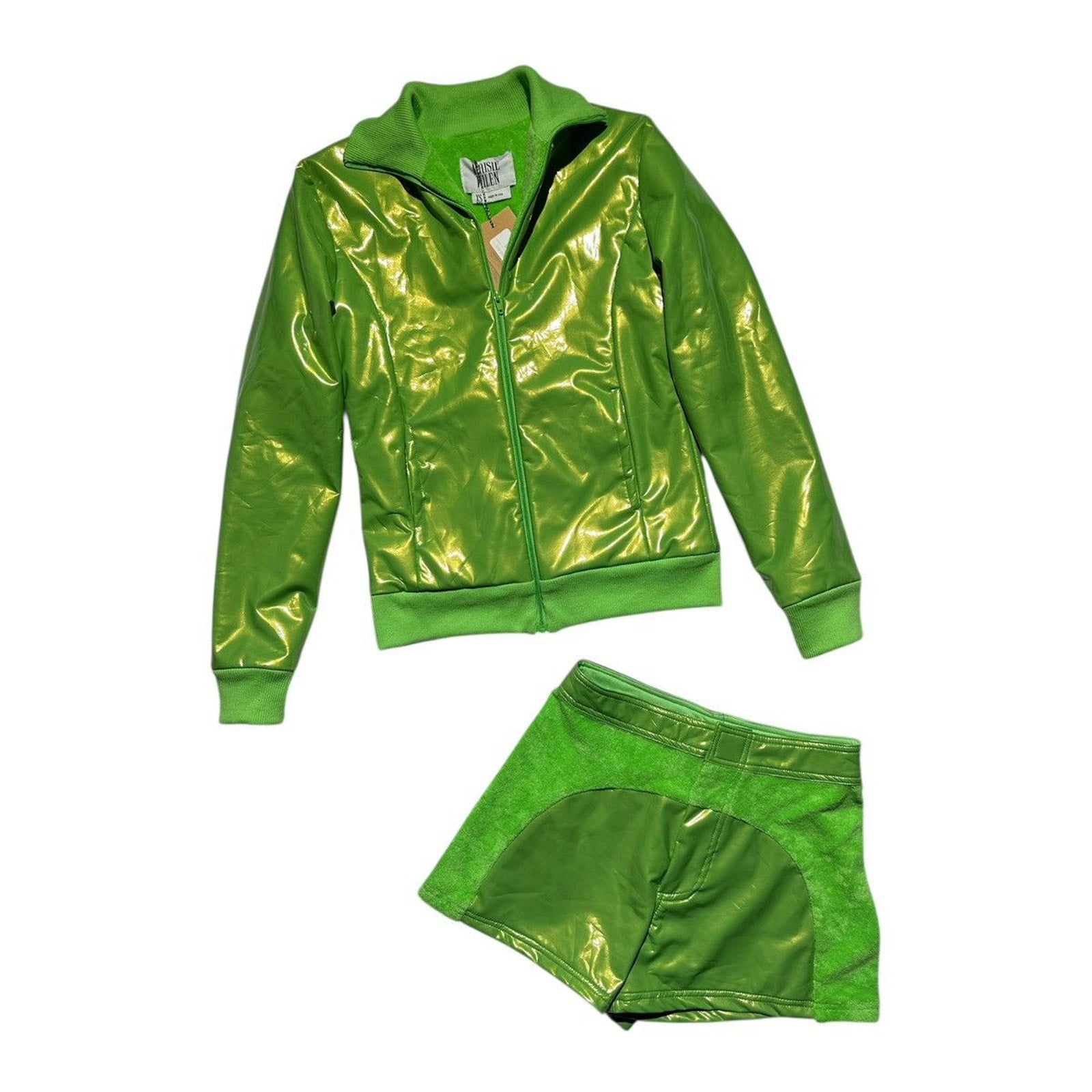 New with tags. Retail $1,300. A glossy, 2 piece set in a vibrant neon green. Terry lined inside for comfort. Shoulders: 14”Pits: 16”Length: 22.5”Sleeve: 23”Waist: 26”Rise: 10”Inseam: 2”Length: 12”Leg Opening: 11”Shipping Policy