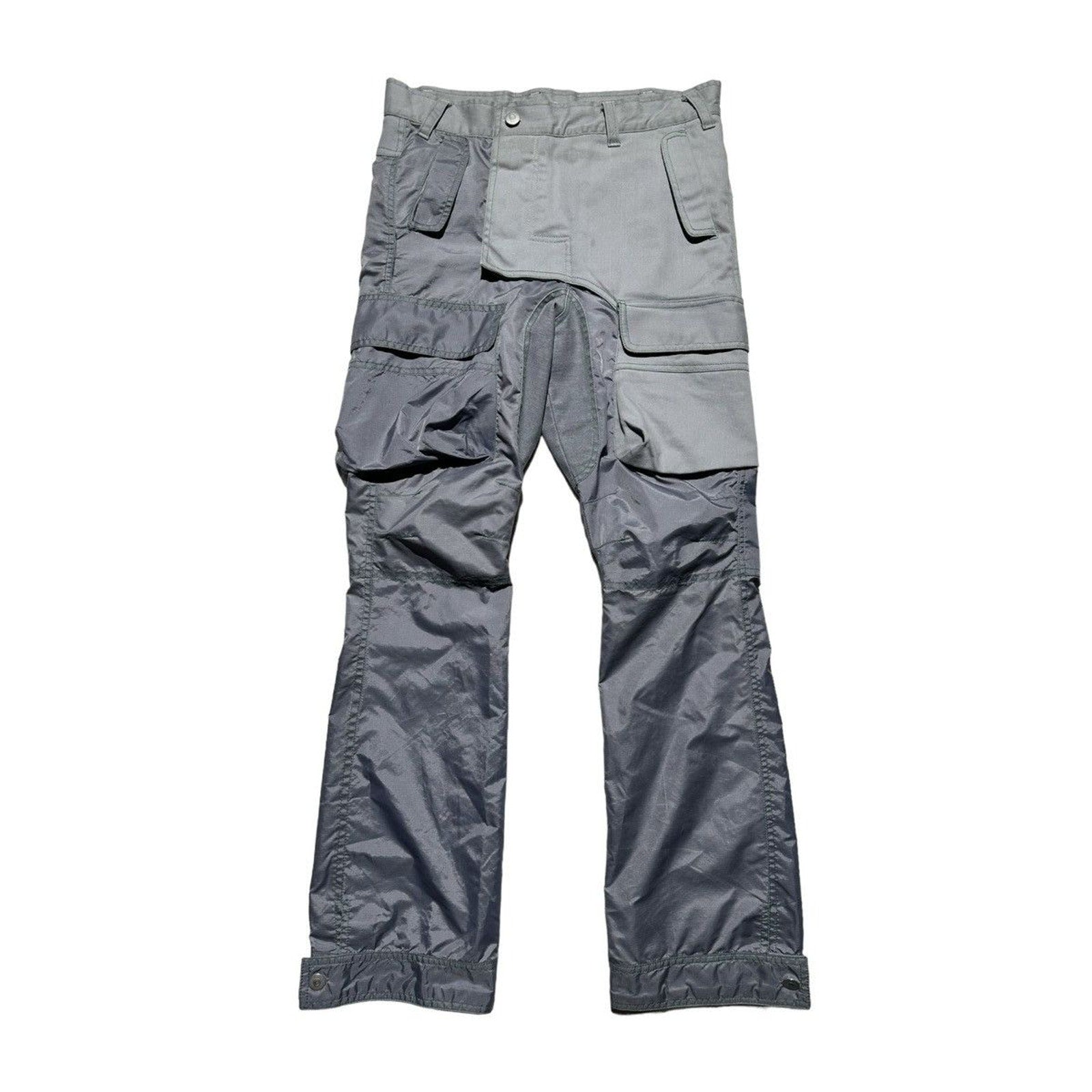 A beautiful grey nylon/canvas/denim hybrid cargo with deep green contrast stitching. Incredible fit with adjustable button bottoms. Waist: 34”Rise: 12.5”Inseam: 32”Leg Opening: 9”Shipping Policy• Please allow 2-5 business days for us to process and ship your order. When your order ships, you will receive your tracking number via email.Refund PolicyAll sales are final.