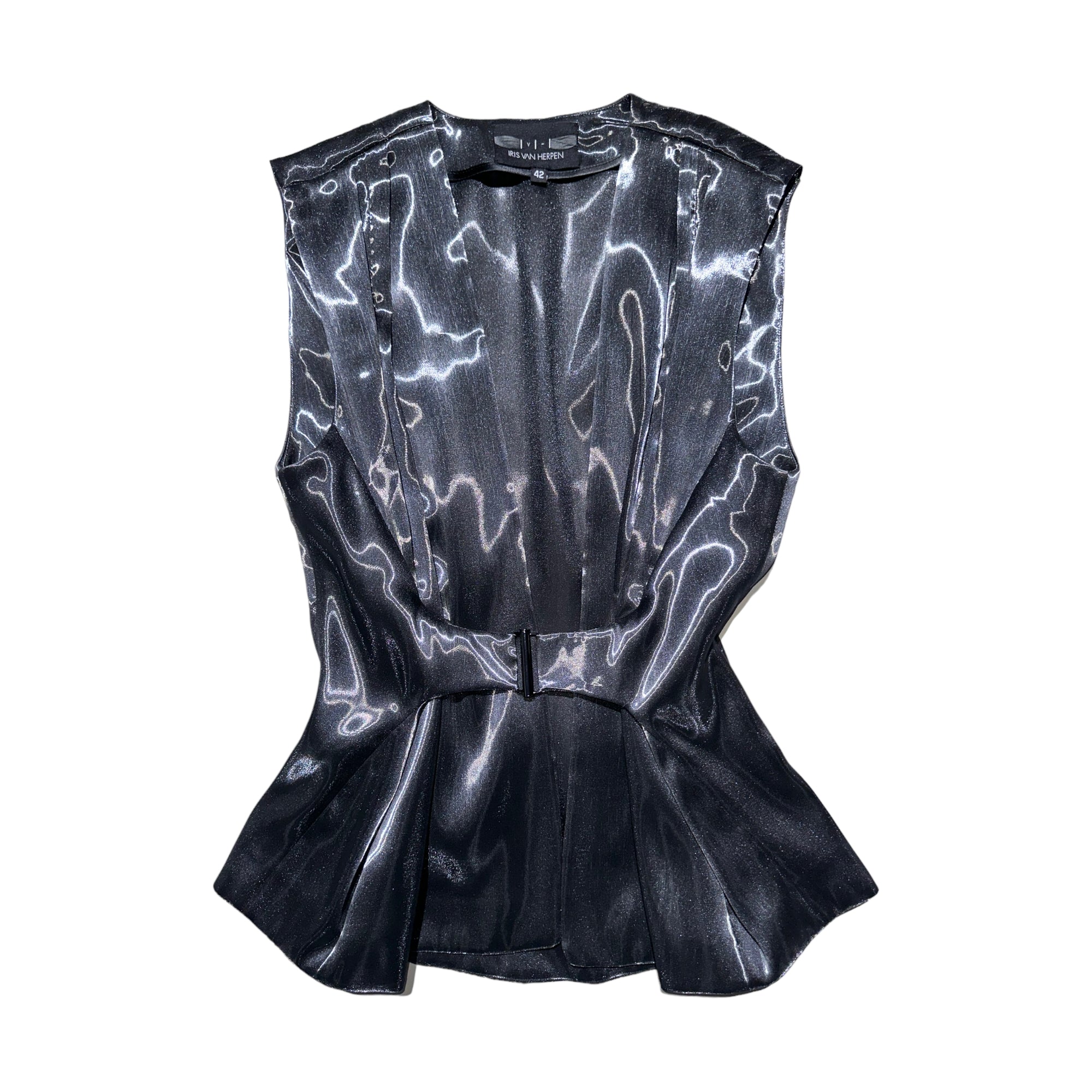 An incredibly beautiful piece that was the center point of the 2014 collection. A well structured vest that contours a women’s body perfectly and still looks stunning on the male figure. The fabric is delicate yet gives off such a strong impression. “Liquid Metal” is the best way to describe the look and feel of it. Features an optional metal twist clasp closure at front.