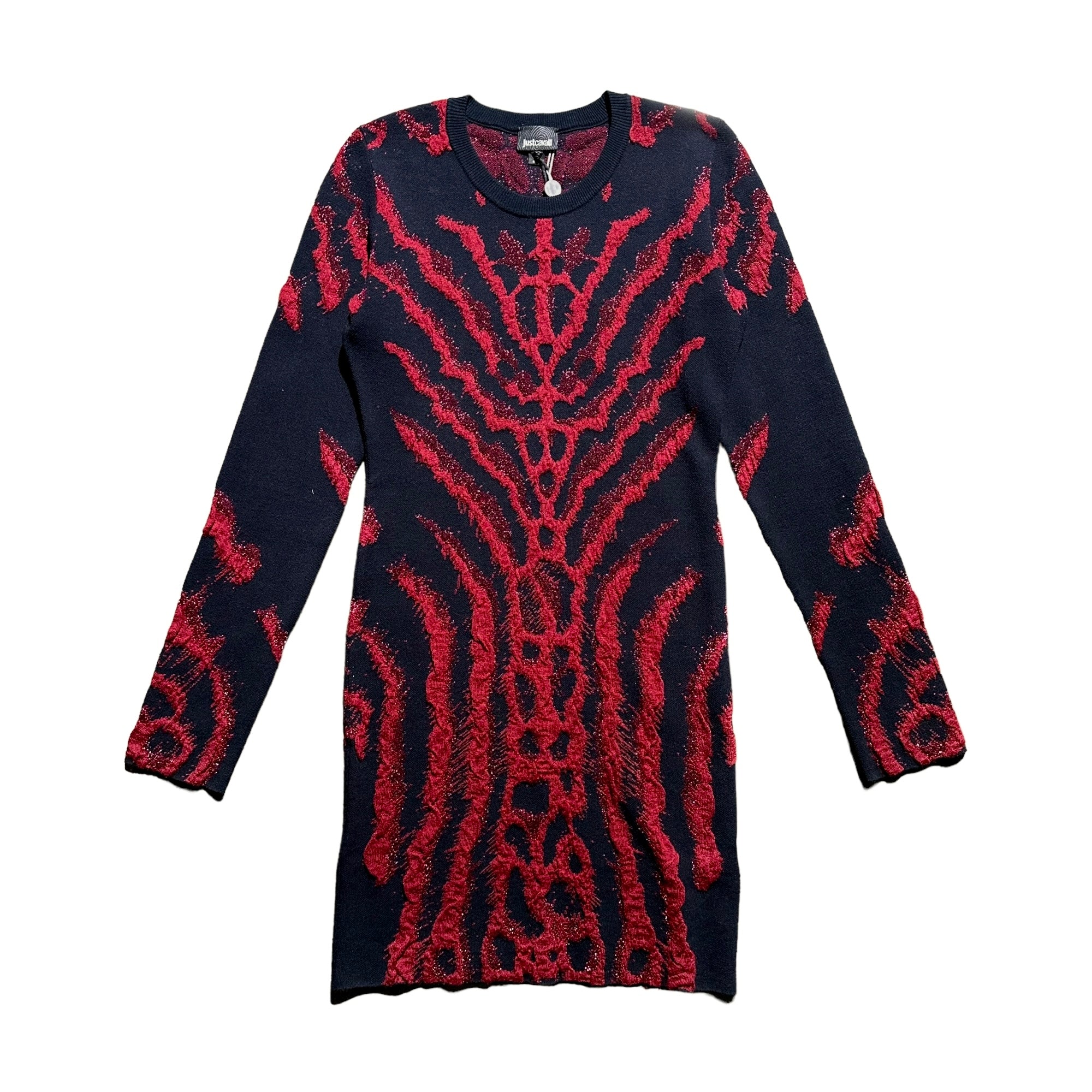 A Unique standout design as expected from Cavalli. This 3D looking effect encompasses the whole dress and is paired with subtle “glitter” particles throughout. This dress is stretchy and body conforming!