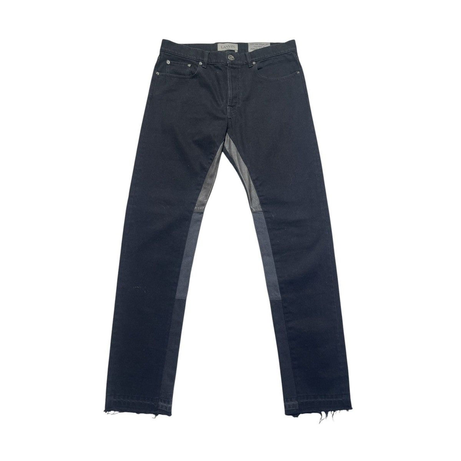 A sturdy and structured black jean with black leather panels and grey denim panels. Waist: 36”Rise: 10”Inseam: 34”Leg Opening: 8”Shipping Policy• Please allow 2-5 business days for us to process and ship your order. When your order ships, you will receive your tracking number via email.Refund Policy• All sales are final.