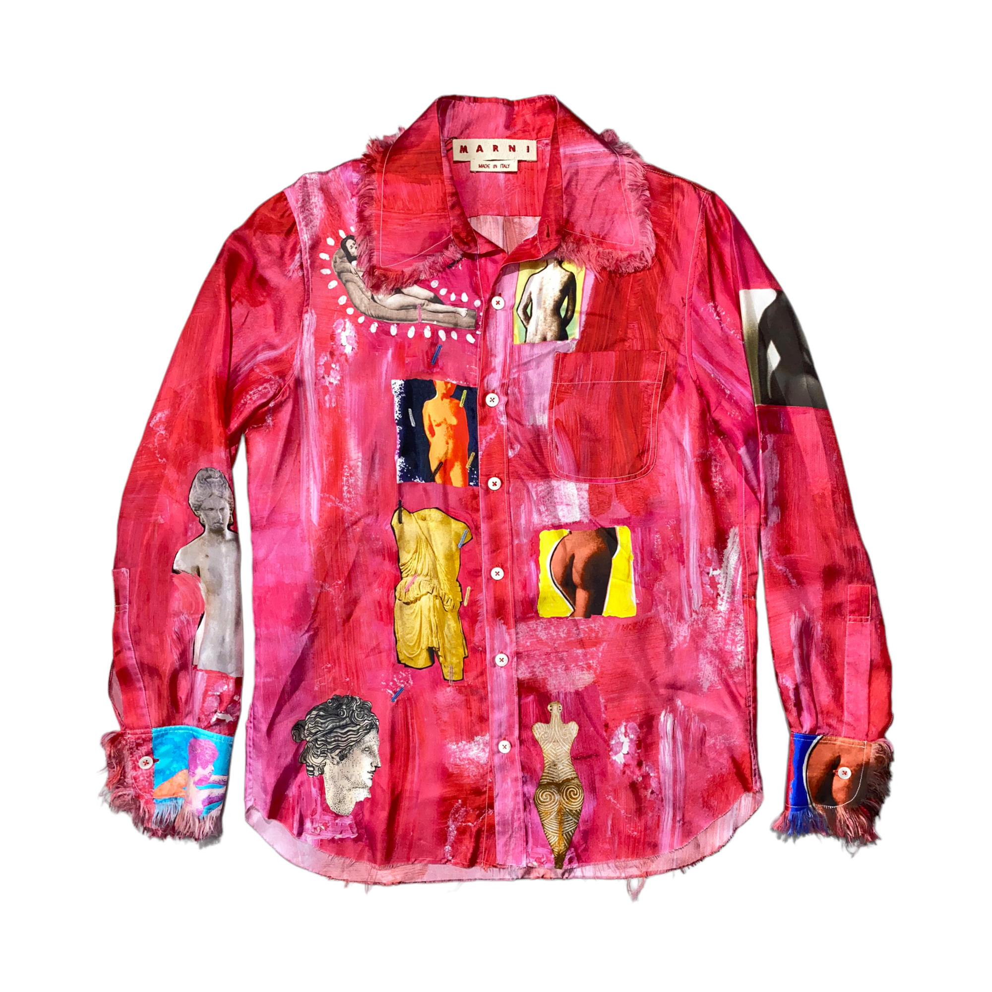 From the SS19 collection. Beautiful offering from marni. Retail $1990 and in amazing condition! A red/pink colored silky button down that looks brush painted throughout. Adorned with printed paintings of nude women, art, and sculptures and more. Fringed at sleeves and neckline. So many details in this piece. Technically a womens piece but has a very oversized/Roomy fit. Very unisex. Great condition. Runway piece!