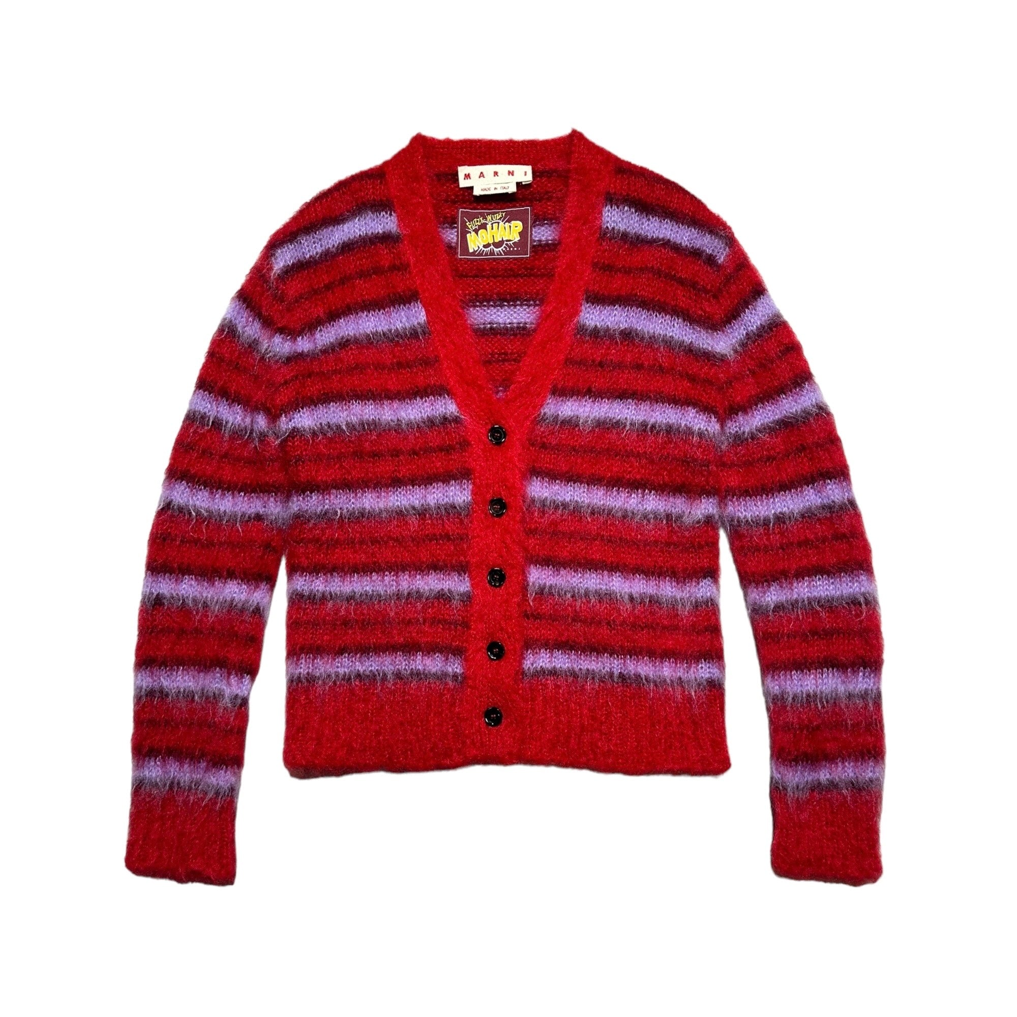 Superb knit mohair cardigan in a striking red and purple color. Super comfortable, stretchy and able to fit many sizes male or female. Retail $1,300