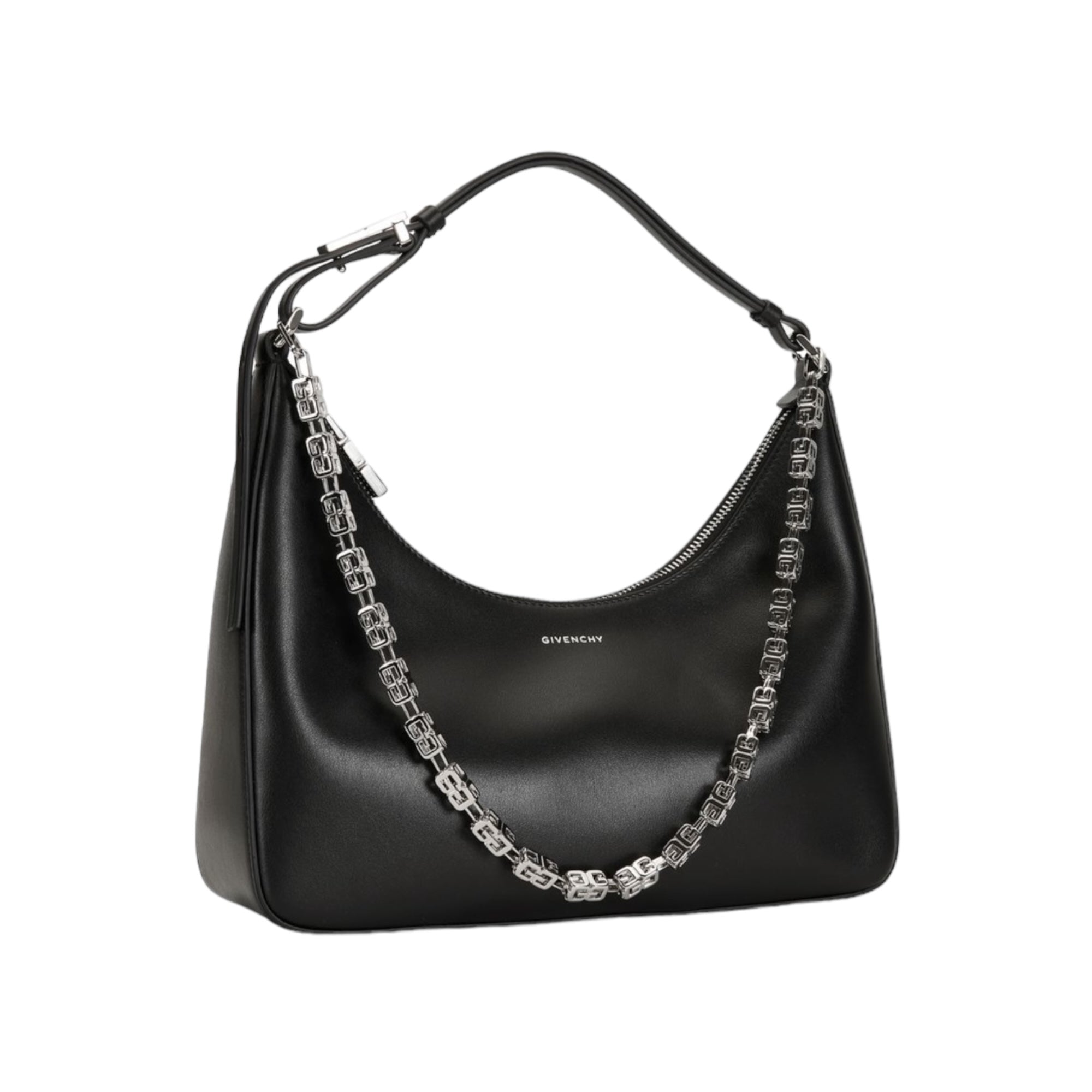 Retail $1,900. Buffed calfskin shoulder bag in black. Logo box chain and adjustable and detachable tonal buffed leather shoulder straps at top. · Logo embossed in silver-tone at face and back face · Zip closure at main compartment · Patch pocket at interior · Tonal buffed calfskin lining at interior · Silver-tone hardware · H12 x W13 x D3 in.
