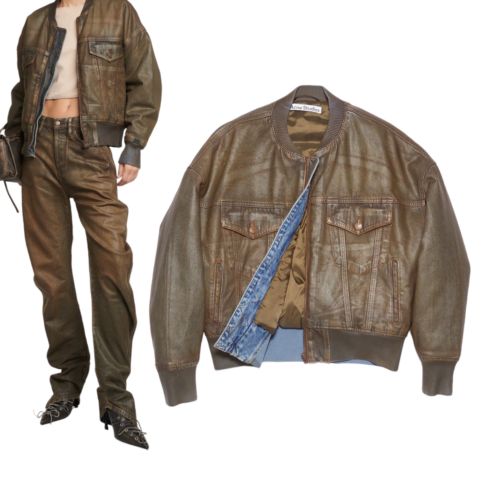 Denim coat with a beautiful brown “mud” waxed treatment, oversized fit. In stores now for $1,500.