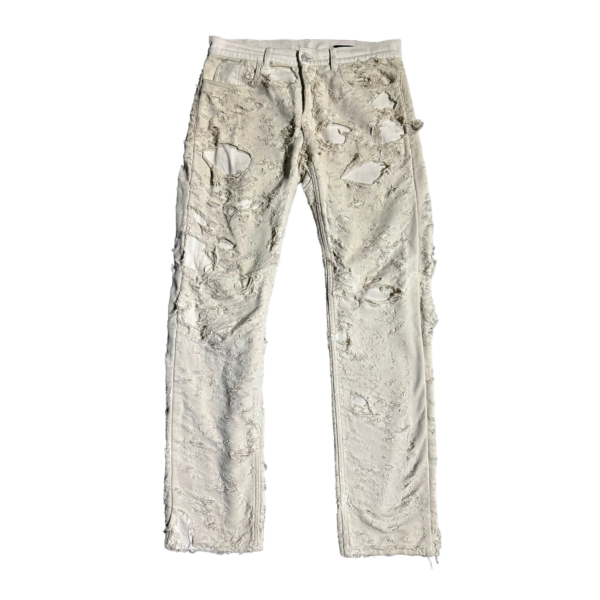 A beautifully made khaki denim pant with cotton layered distressed outer. Tagged size 32 but fits/measures bigger. Waist: 34”Rise: 10”Inseam: 34”Leg Opening: 8”