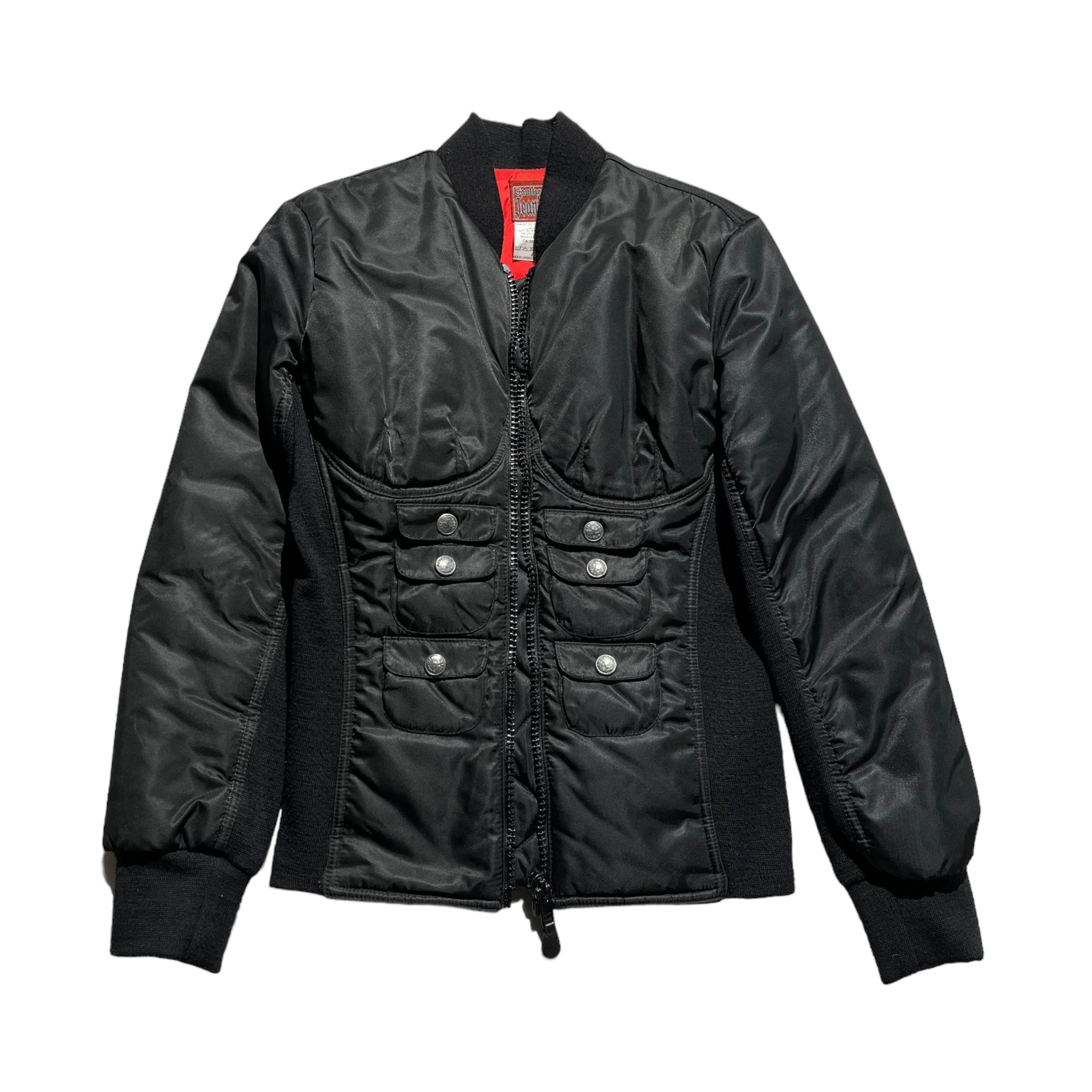 This interesting and rare nylon bomber features an structure fit and pocketing depicting a 6 pack. This is a statement, gives your body a crazy look. Pairs well with wide leg pants. Pits: 19.5”Shoulders: 17”Length: 25”Sleeves: 23”