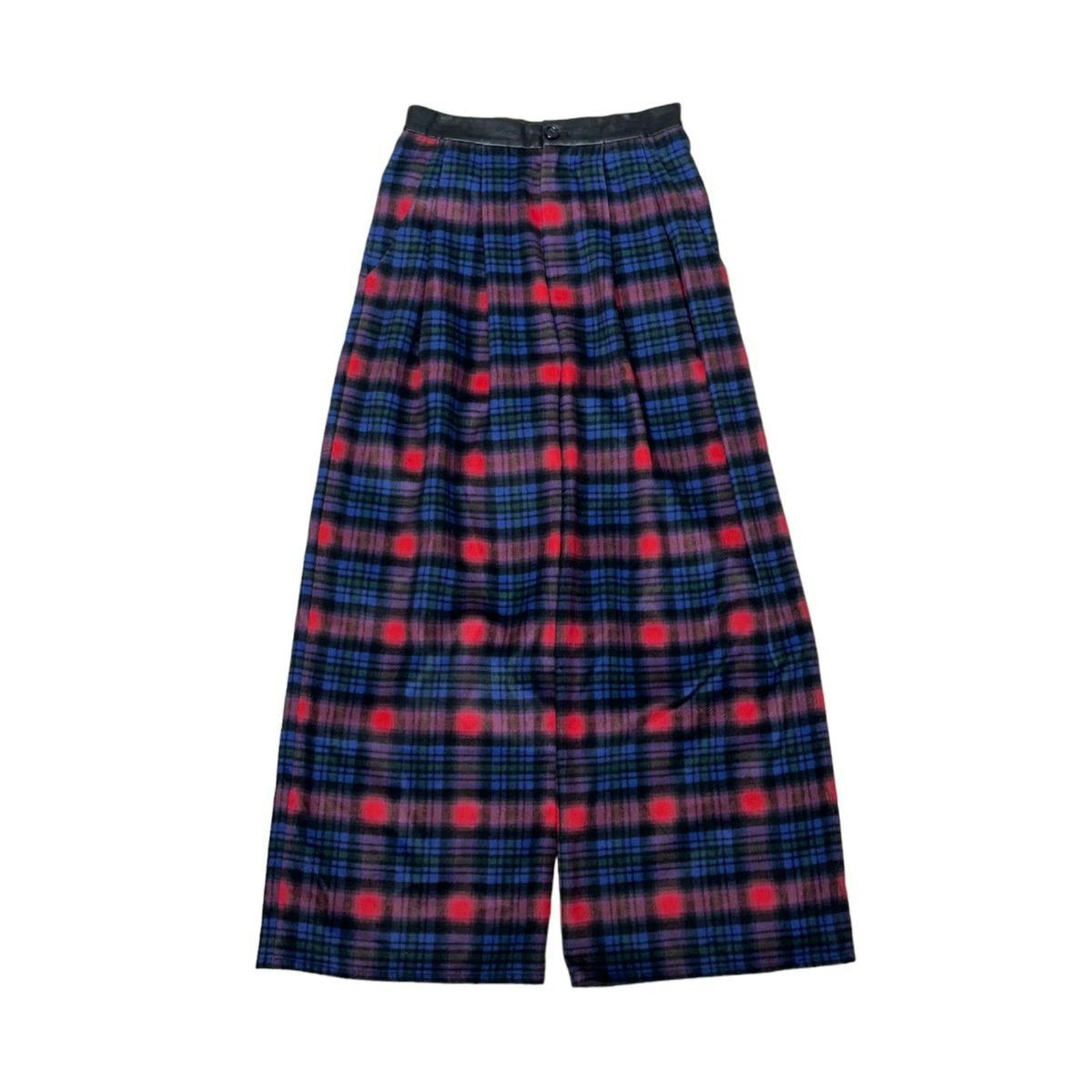 A thick well made trouser in a plaid multicolor. Faux leather trimming at waist band and back pockets. Wide leg baggy design that drapes perfectly.
