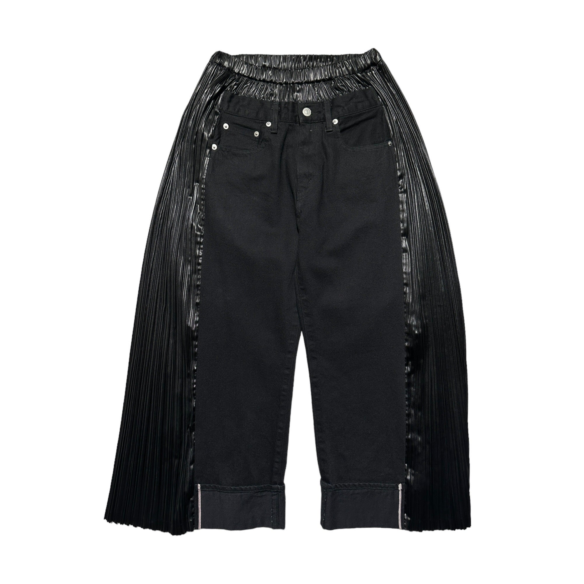 Retail $1,800. Wide-leg paneled denim and garment-pleated wool-blend canvas jeans colorblocked in double black. Cropped leg design with the perfect fade and distressing throughout. Five-pocket styling. Belt loops and elasticized waistband that fits multiple sizes.