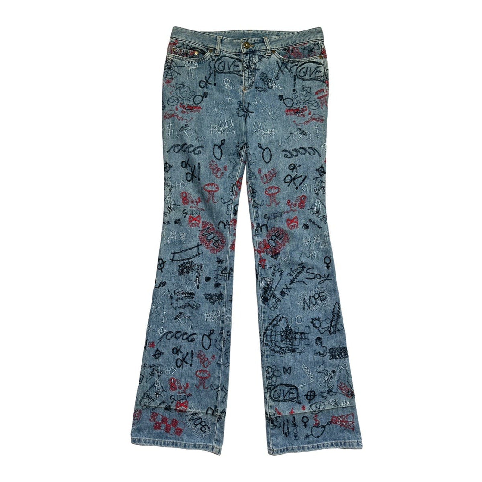 An extremely beautiful pair. From 2003 while McQueen was alive and cranking out HITS. A quality denim in an essential blue with black, red, and white embroidered words & images all throughout. Easy to make a KILLER fit in these. A great find. Waist: 30”Rise: 9”Inseam: 36”Leg opening: 10”Shipping Policy • Please allow 2-5 business days for us to process and ship your order. When your order ships, you will receive your tracking number via email.Refund PolicyAll sales are final.