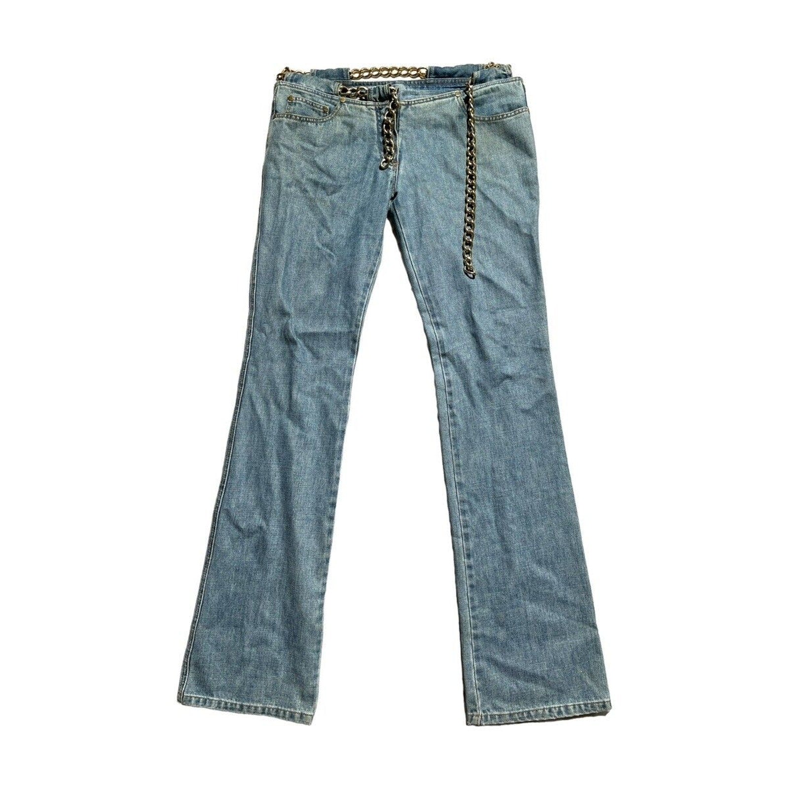 An extremely beautiful pair. Semi flared fit, low rise. From 2005 while McQueen was alive and cranking out HITS. A quality denim in an essential blue with cut out waist and gold chain roped throughout that you can tie to hug the body. Easy to make a KILLER fit in these. A great find.
