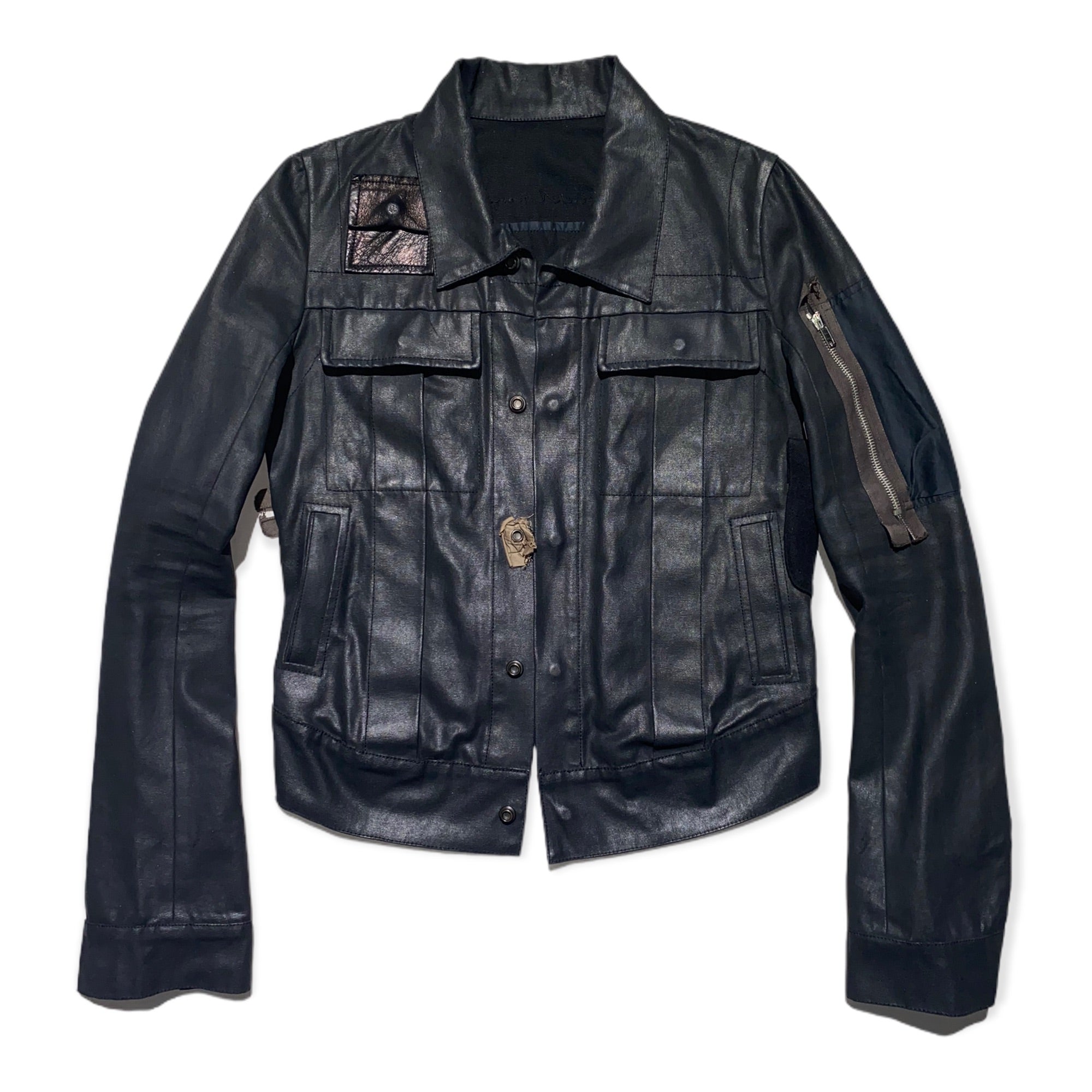 Extremely rare. THE rick owens denim jacket, this went down the runway in 2003 and is an absolute grailed. Patchwork paneling, denim and coated canvas. The material has a subtle glitter applied to it that makes this piece even more beautiful. OUTSTANDING CONDITION for this 19 year old piece. Button clasp closure. Will fit a mens small, and a womens medium/large. This is the jacket you can keep forever.