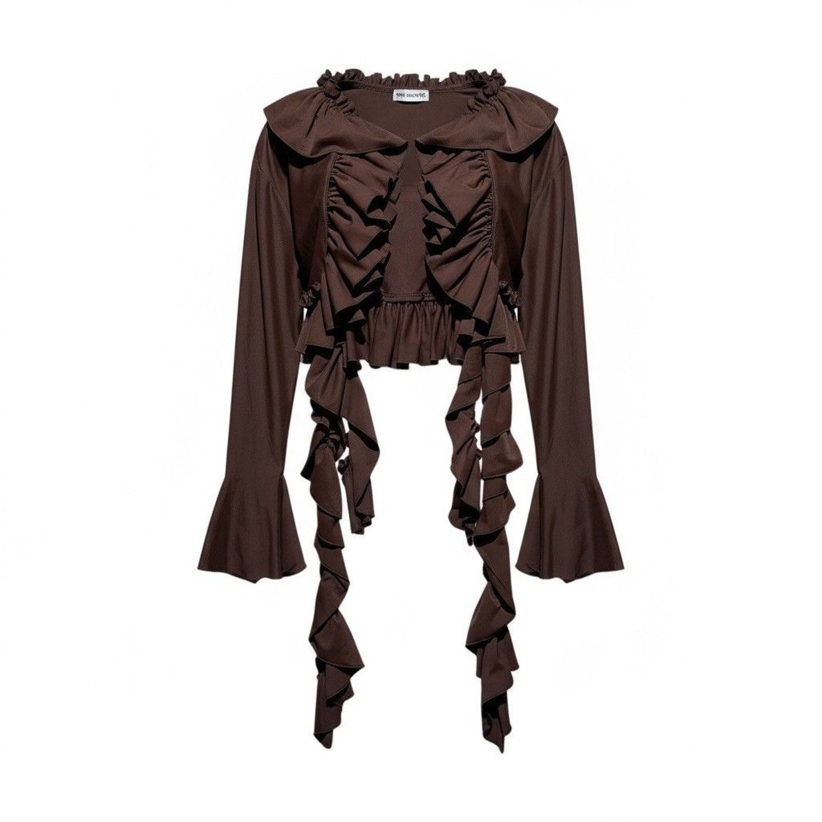 Deep brown stretchy fabric bolero with ruffled designs. Shoulders: 18”Pits: 15”Length: 16”Sleeves: 24”Shipping Policy• Please allow 2-5 business days for us to process and ship your order. When your order ships, you will receive your tracking number via email.Refund Policy• All sales are final.