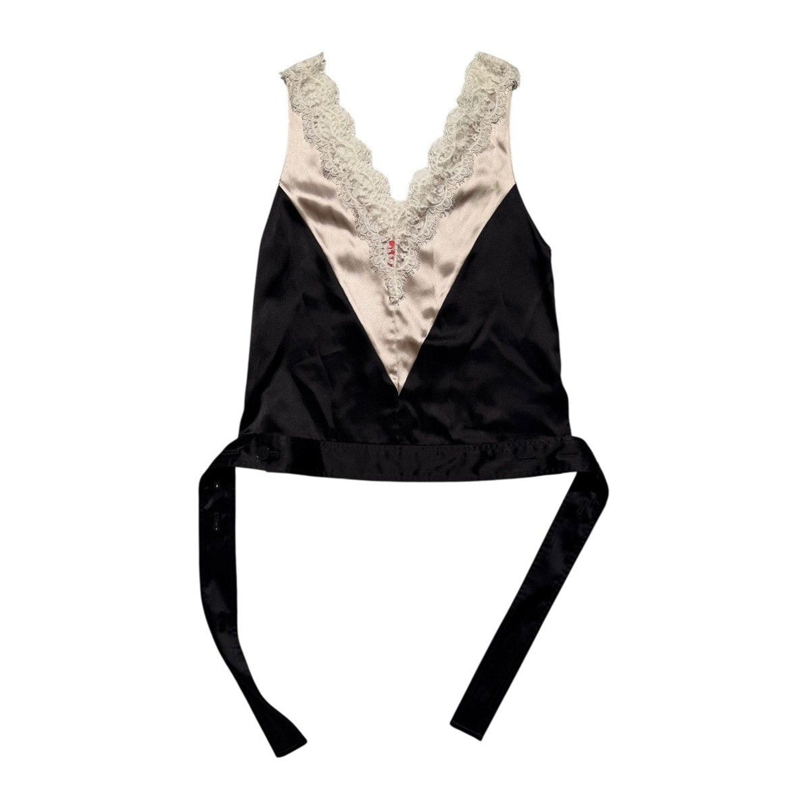 New with tags. MSRP: $1,091 Two-tone satin Chantilly lace paneled top with buttoned waist straps for an adjustable fit. Shoulders: 12.5”Pits: 16.5”Length: 21”Shipping Policy• Please allow 2-5 business days for us to process and ship your order. When your order ships, you will receive your tracking number via email.Refund Policy• All sales are final.
