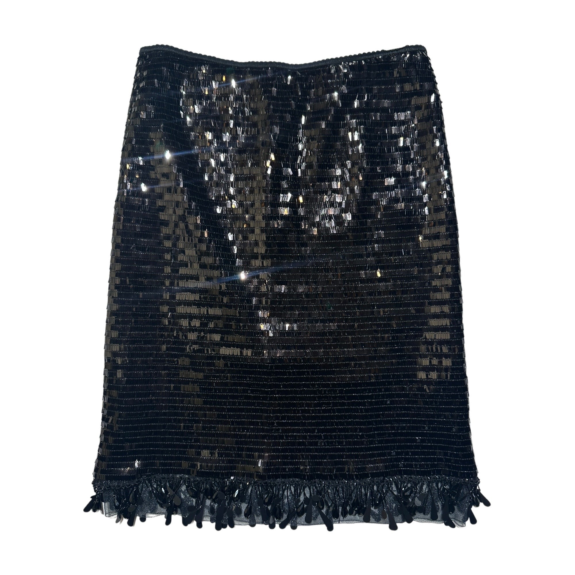 Deep black mini skirt with dazzling sequins & hanging beads at bottom. Satin lined, zipper at back, semi stretchy for comfort. Rare piece from an archived collection. Waist: 28-30”Hip: 36”Length: 23”