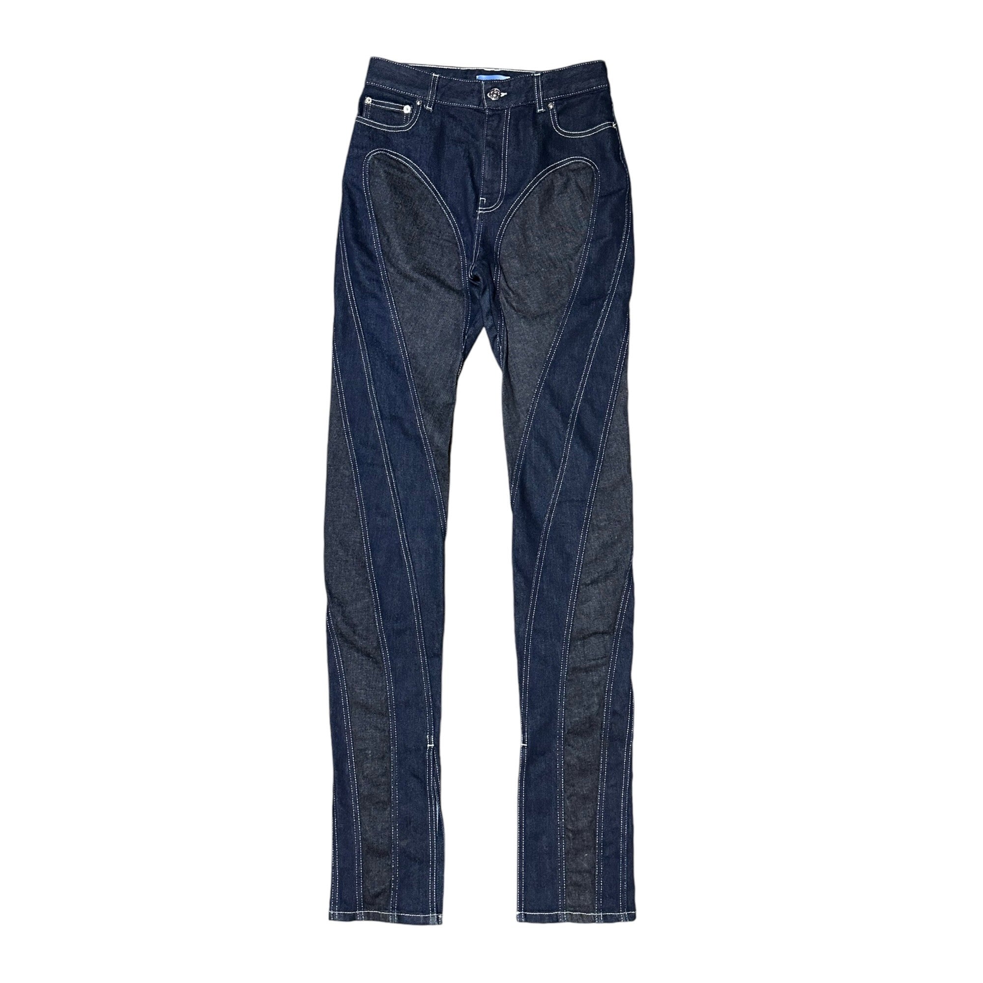 A quality denim in the Classic Mugler style. Spiral design that compliments the female body. 2% elastane for stretch and comfort  Waist: 26”Rise: 12”Inseam: 37.5”Leg opening: 6”