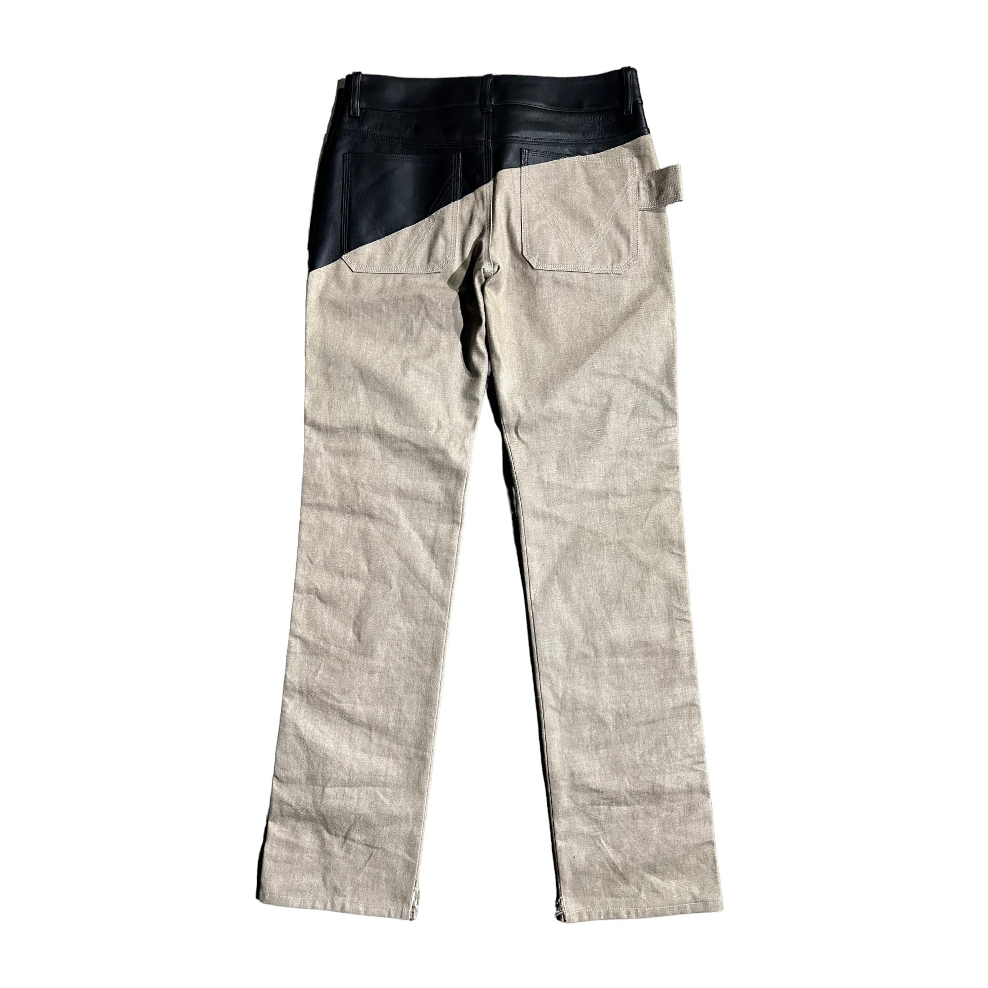 Beautiful lambkin leather and cotton diagonally split design carpenter pant with incredible tailoring. Runway model. 1” split at bottoms.  Waist: 33”Rise: 10”Inseam: 35”Leg Opening: 8”