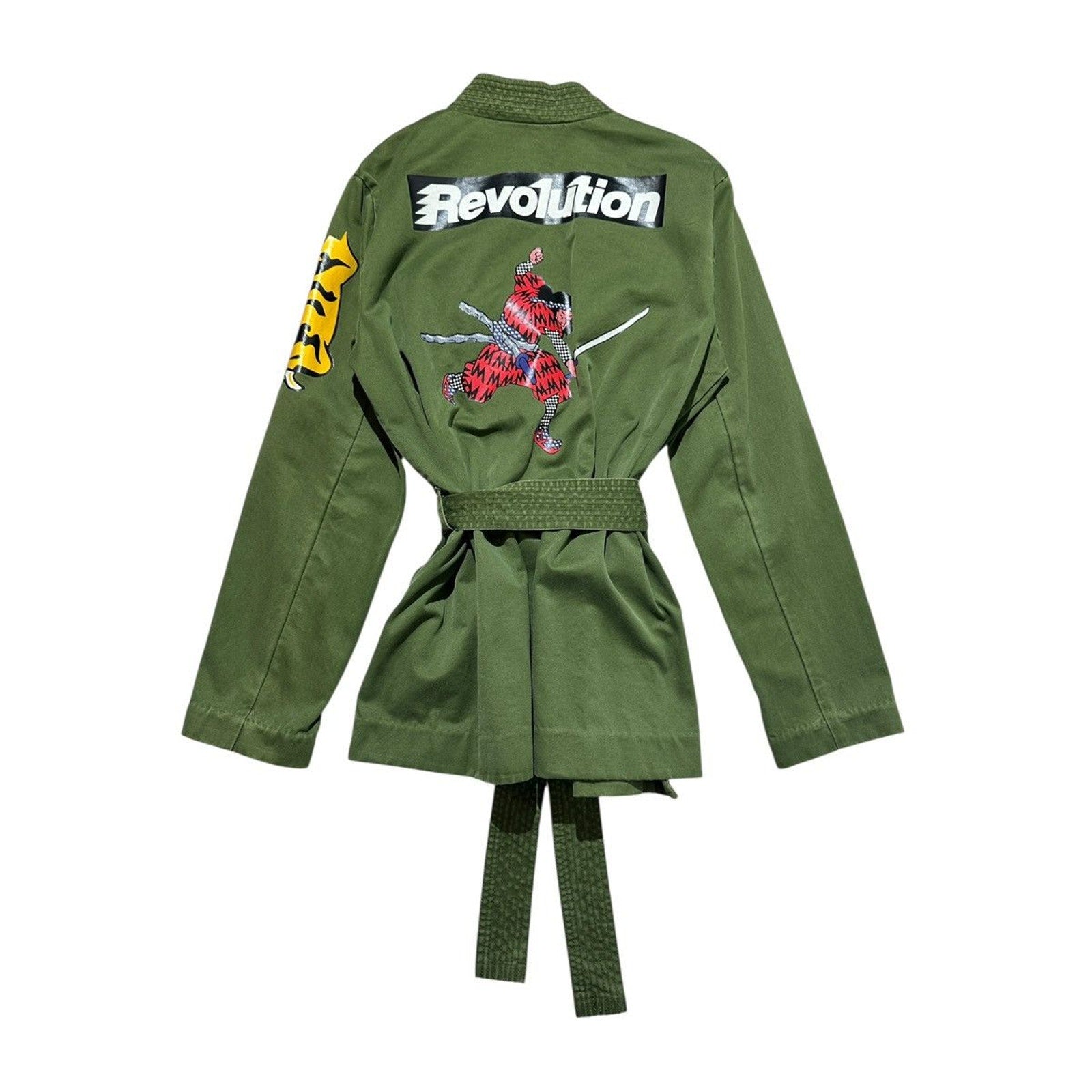 A sturdy olive green cotton jacket with a kimono style design, removable strap, and graphics throughout. Shoulders: 17”Pits: 19”Length: 29”Sleeves: 25”Shipping Policy• Please allow 2-5 business days for us to process and ship your order. When your order ships, you will receive your tracking number via email.Refund Policy• All sales are final.