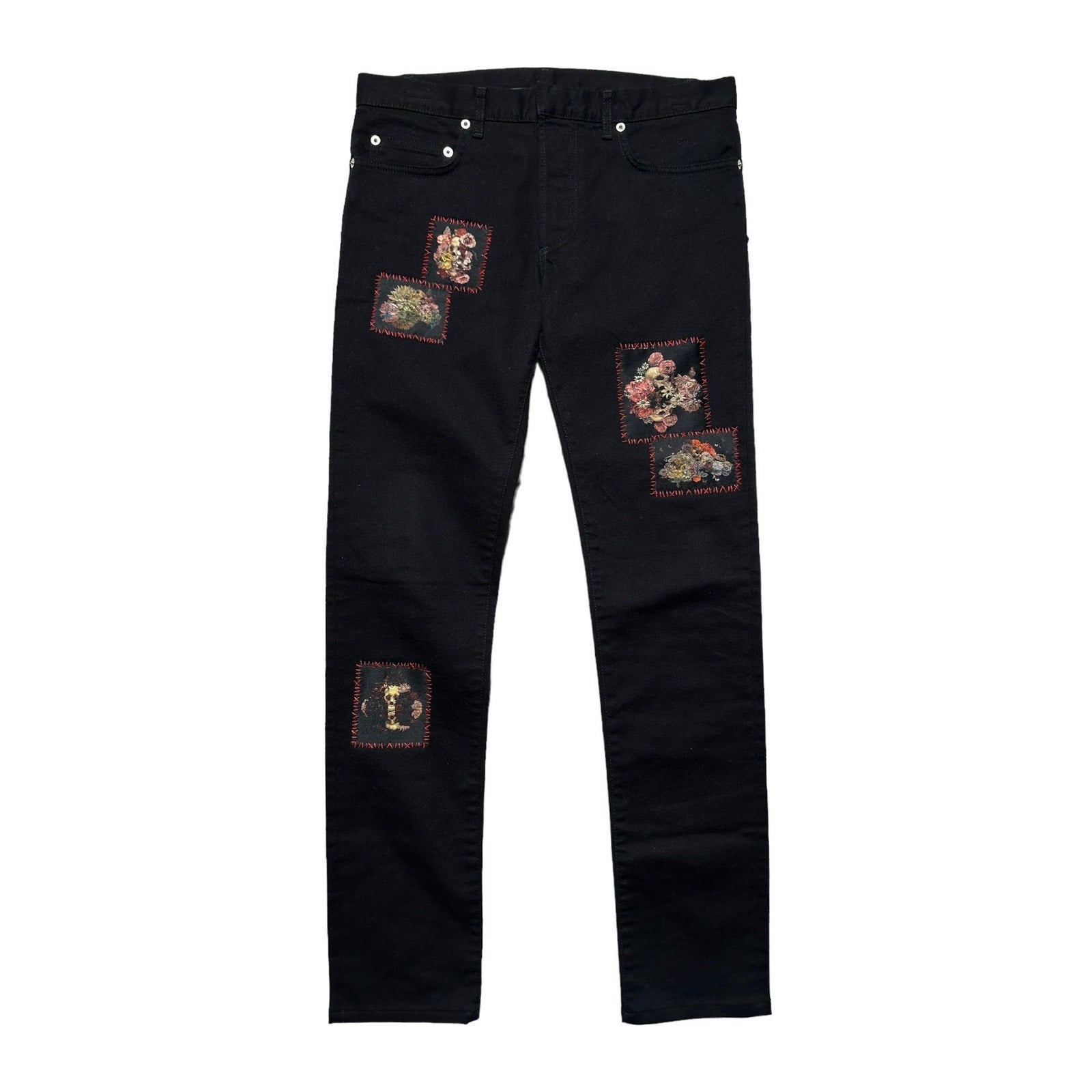 A rare runway piece from an iconic collection. Deep black slim fit denim with beautiful photo realistic patches woven throughout with striking red stitching. Waist: 31”Rise: 9.5”Inseam: 31”Leg Opening: 6.5”Shipping Policy• Please allow 2-5 business days for us to process and ship your order. When your order ships, you will receive your tracking number via email.Refund Policy• All sales are final.